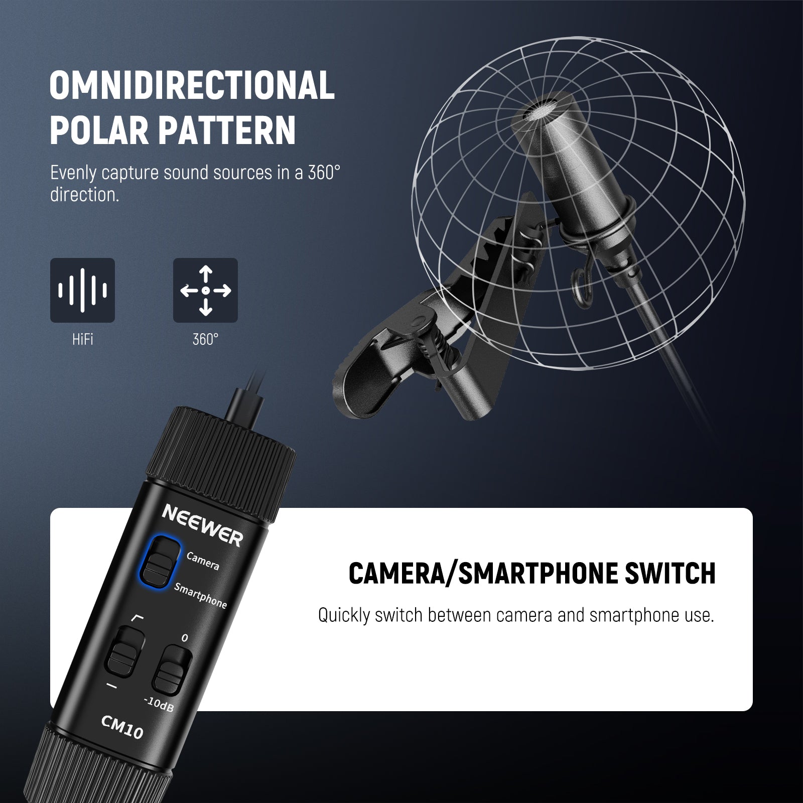 • Plug & Play Mic for Phone/Camera- Simply plug this mini lav mic into your phone, camera, computer, laptop gear via the 3.5mm TRRS connector for instant & professional recording. No batteries or drivers needed. The "Camera/Smartphone" switch allows seamless adaptation when recording with different devices