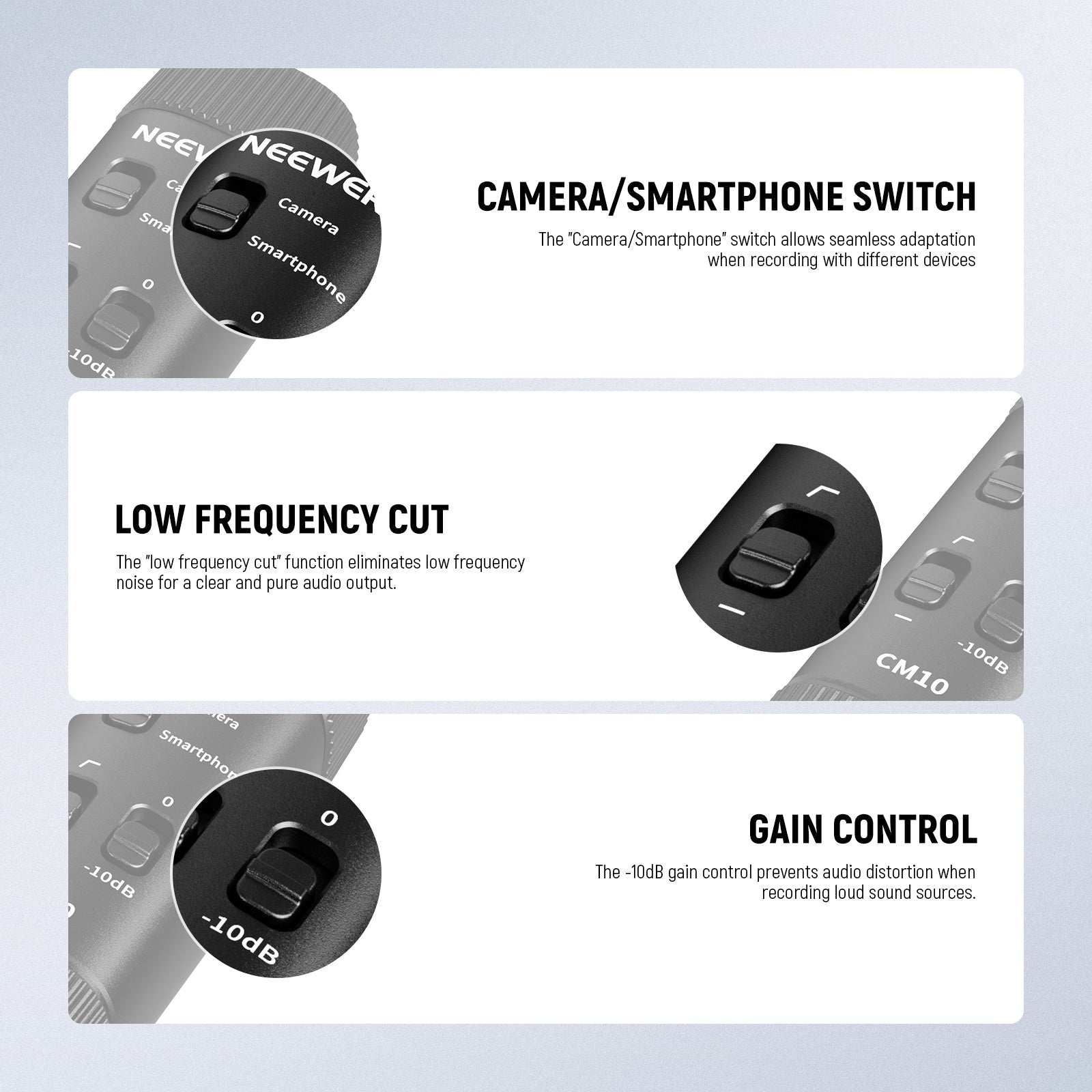 • Low Frequency Cut & Gain Control- The "low frequency cut" function eliminates low frequency noise for a clear and pure audio output. And the -10dB gain control prevents audio distortion when recording loud sound sources