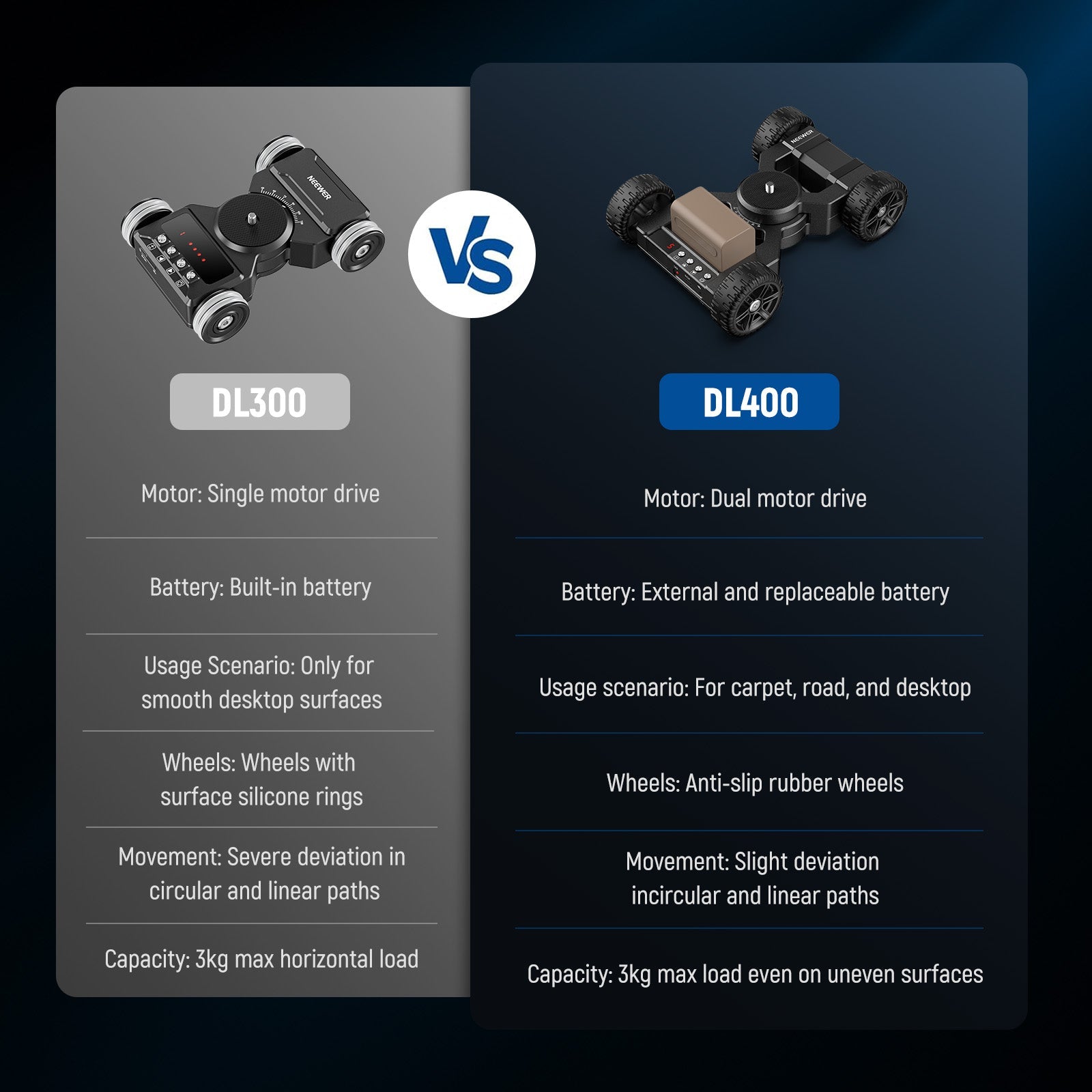 - Enhanced Motorized Camera Dolly Kit- The DL400 motorized camera slider car upgrades with ultra quiet dual motor and nonslip rubber wheels with two front wheel drive, handles up to 6.6lb/3kg for smooth move and uninterrupted video recording (below 30db). Enhanced grip on most surfaces, not just floors and desktops. The 360° ball head, phone holder, and action camera adapter accessories are included for the top 1/4" screw. Compatible with Canon Sony Nikon Fujifilm fuji mirrorless vlog cameras