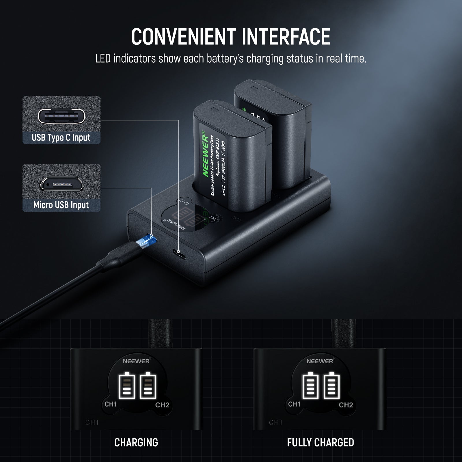 NEEWER Replacement Battery and Charger Set for DMW-BLK22 Lumix