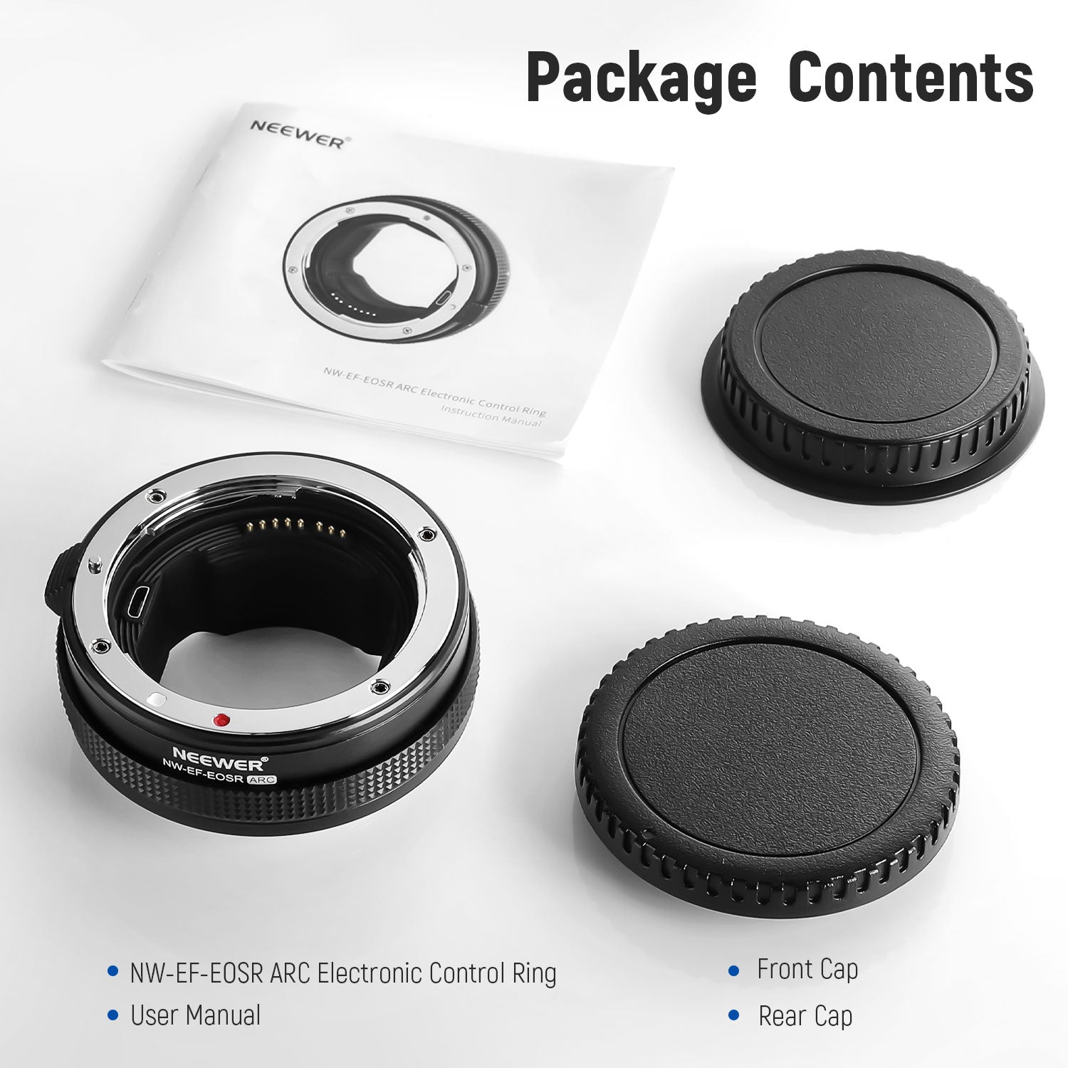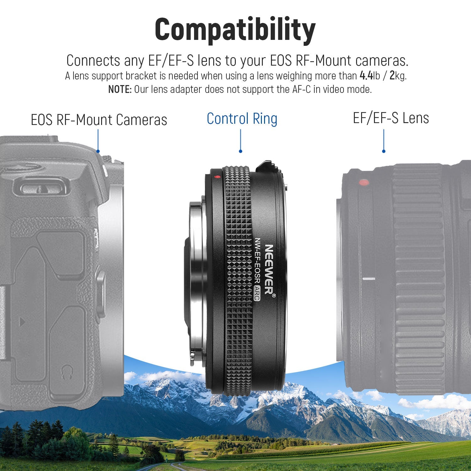 - Expand Compatibility- NEEWER NW-EF-EOSR ARC lens adapter can connect any EF/EF-S lens to an EOS R camera, including EOS R Ra RP R5 R6 R3 R5C R7 R10 R6 Mark II R50 and R8. Notes: 1. This lens adapter does not support the AF-C in video mode. 2. A lens support bracket is necessary when using a lens weighing over 4.4lb/2kg
