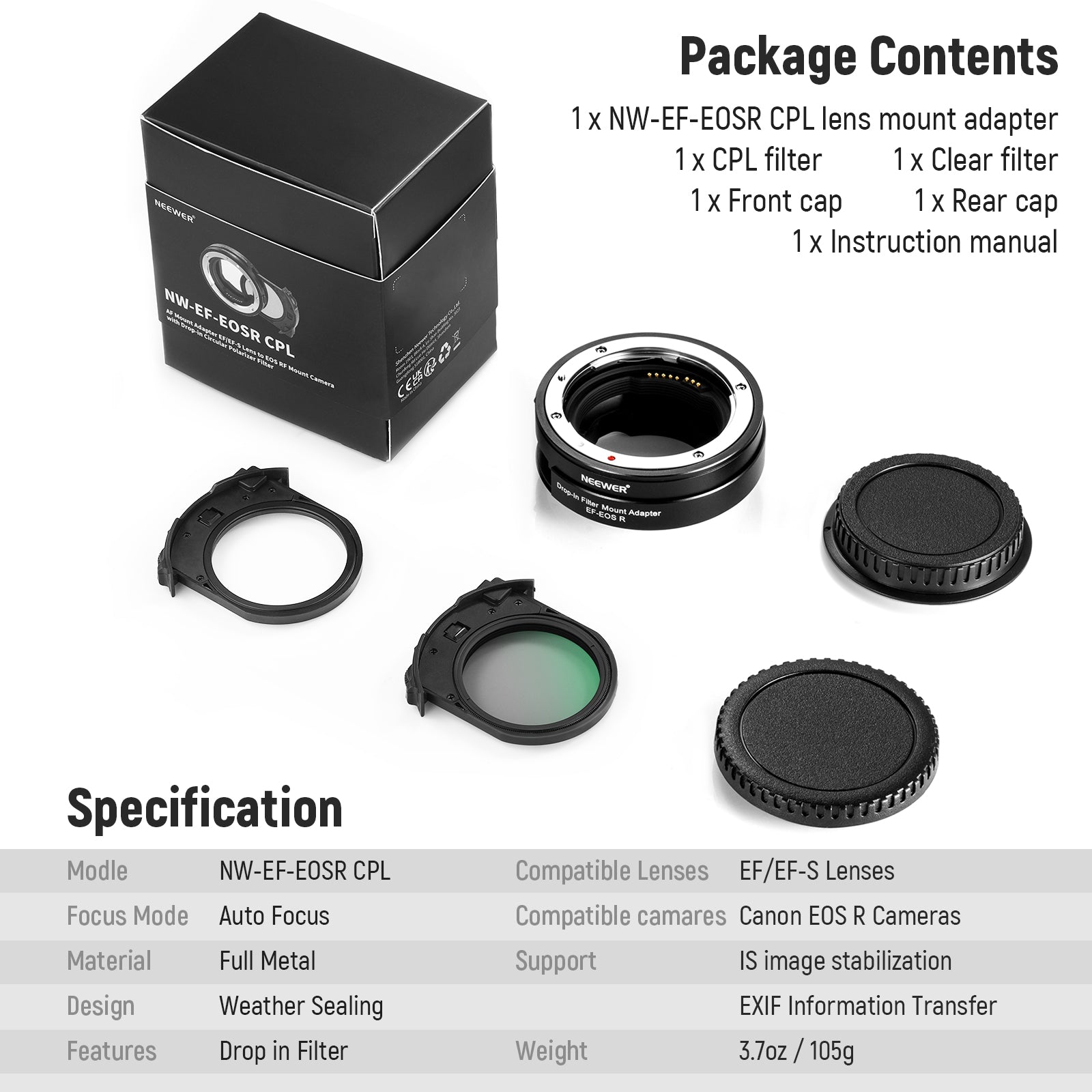 • 1 x NW-EF-EOSR CPL Lens Mount Adapter