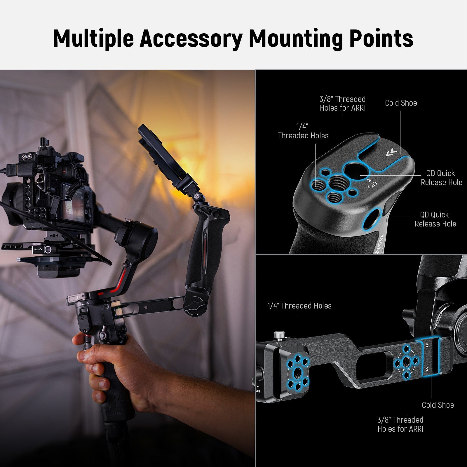 - Multiple Accessory Mounting Points- NATO rail, 1/4" threads, 3/8" threads with locating holes for ARRI, and cold shoes can connect several accessories for enhanced video quality. These accessories included CM14 Pro Microphone, PL81 LED Video Light, ST25 Magic Arm, MA006 Monitor Mount, and F500 Field Monitor. QD sockets can quickly connect GA016/G1019 Shoulder Strap