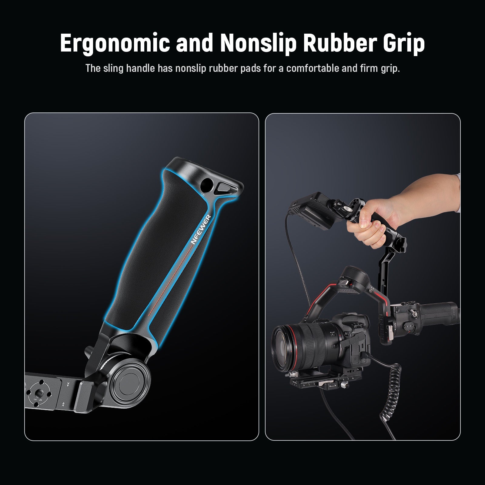 - Ergonomic and Nonslip Rubber Grip- The sling handle has nonslip rubber pads for a comfortable and firm grip. It allows you to hold the gimbal steadily for low angle shots and minimizes arm muscle pain during extended shooting sessions