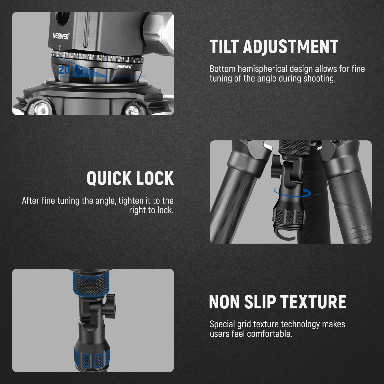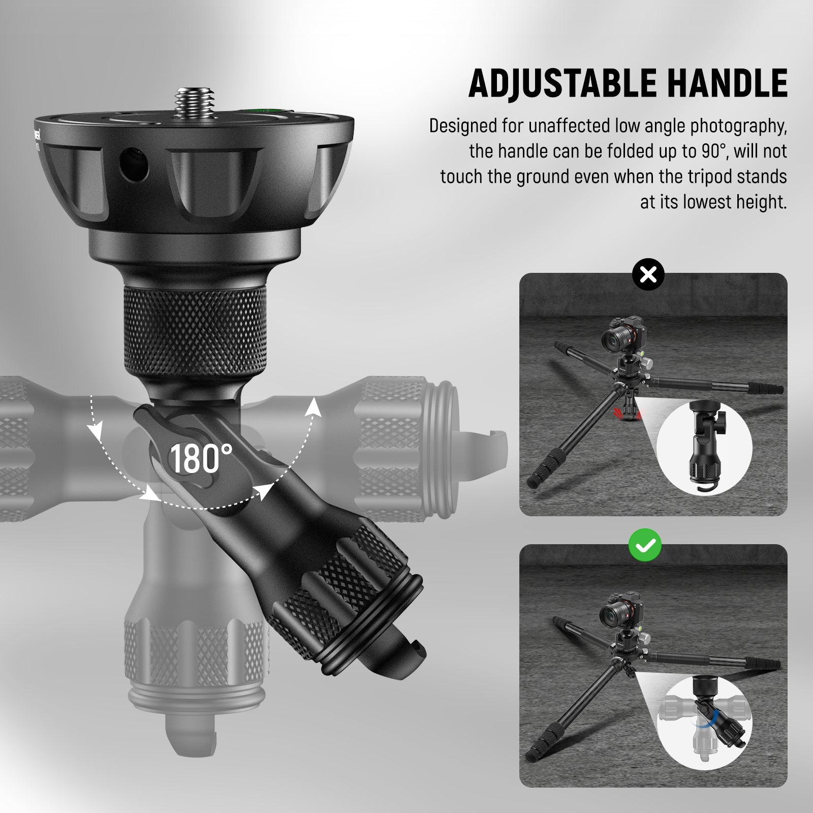 - Ergonomic & Foldable Handle- Designed for unaffected low angle photography, the handle can be folded up to 180°, will not touch the ground even when the tripod stands at its lowest height, and easily locked with a screw knob. Also upgraded with a widened touch surface of the ergonomic handle for a more secure grip and prevents accidental falling off