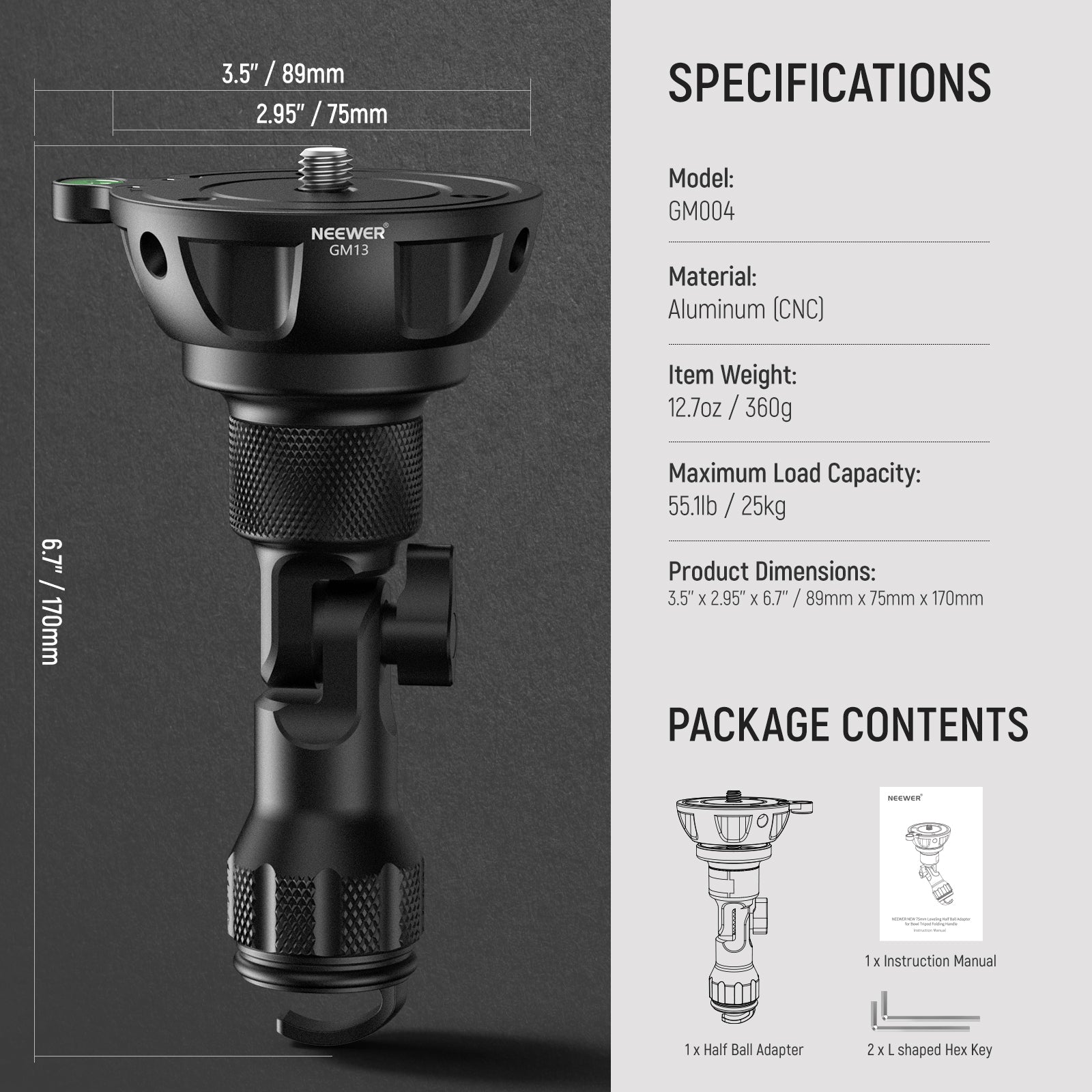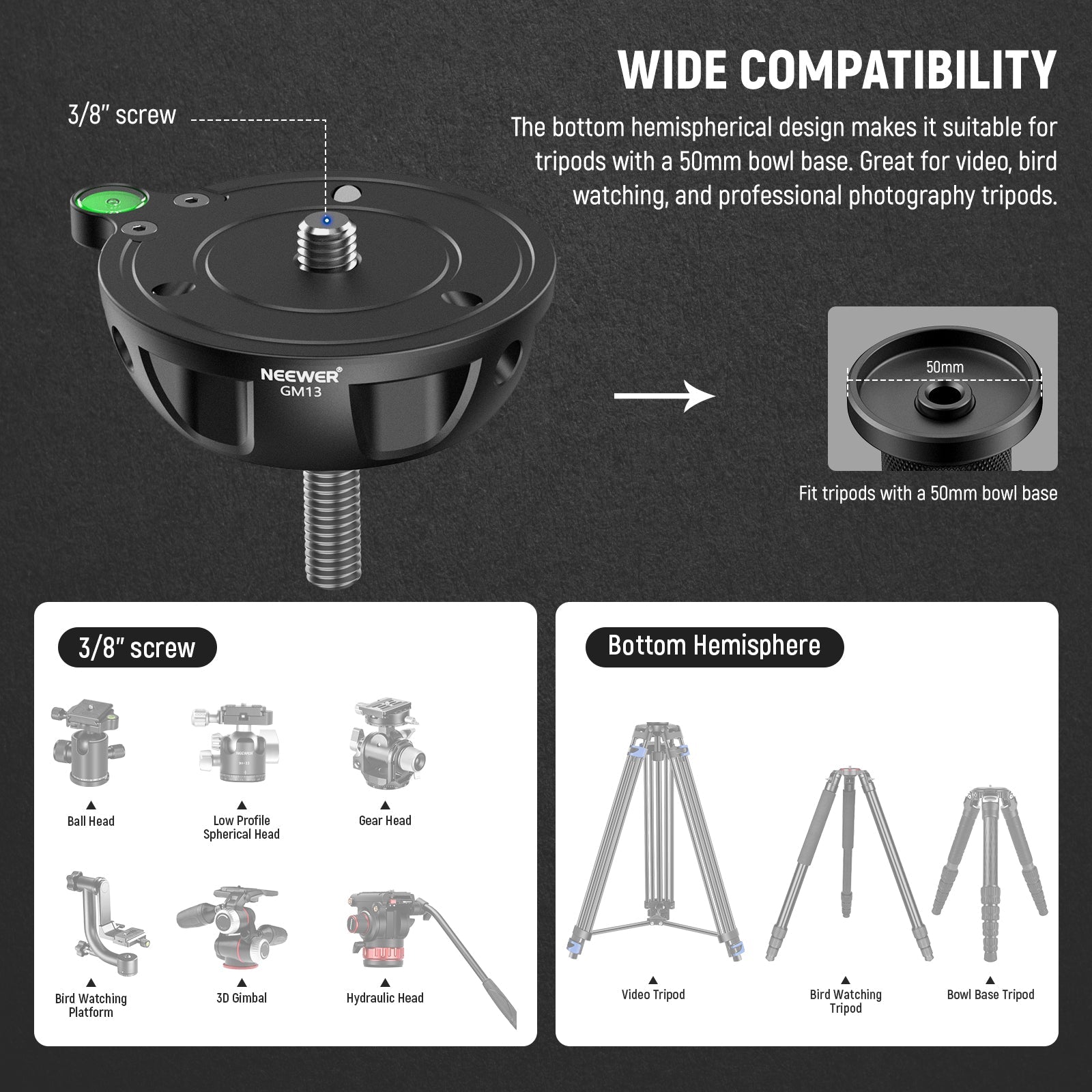 - 75mm Half Ball Leveling Adapter- Compatible with any 75mm bowl tripods, this half ball leveling adapter lets you achieve ideal angles for panoramic photography. The ⌀50mm smaller bowl base lowers gravity for increased stability for cameras, and allows greater flexibility for unique angles and perspectives when mounted on tripods