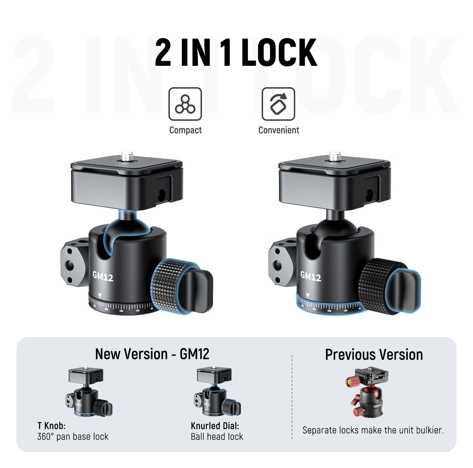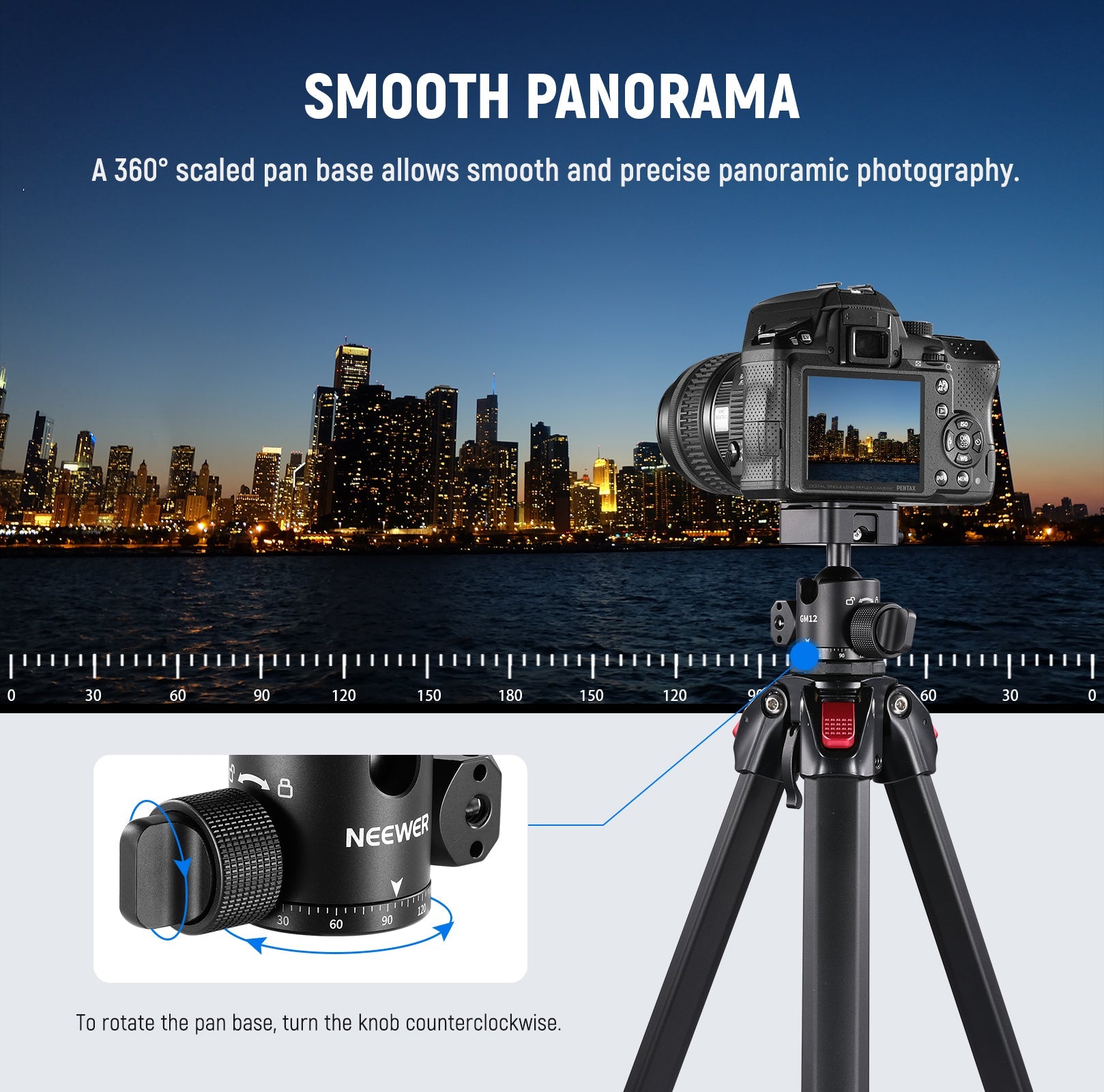• Panoramic Base & Combined Locking Knob- Photographers can easily achieve panoramic pictures on the 360° panning base with precise scale markings. The upgraded 2 in 1 dial and knob combination makes the ball head more compact and position setups more convenient — by fastening the ball head and the pan base in 1 step