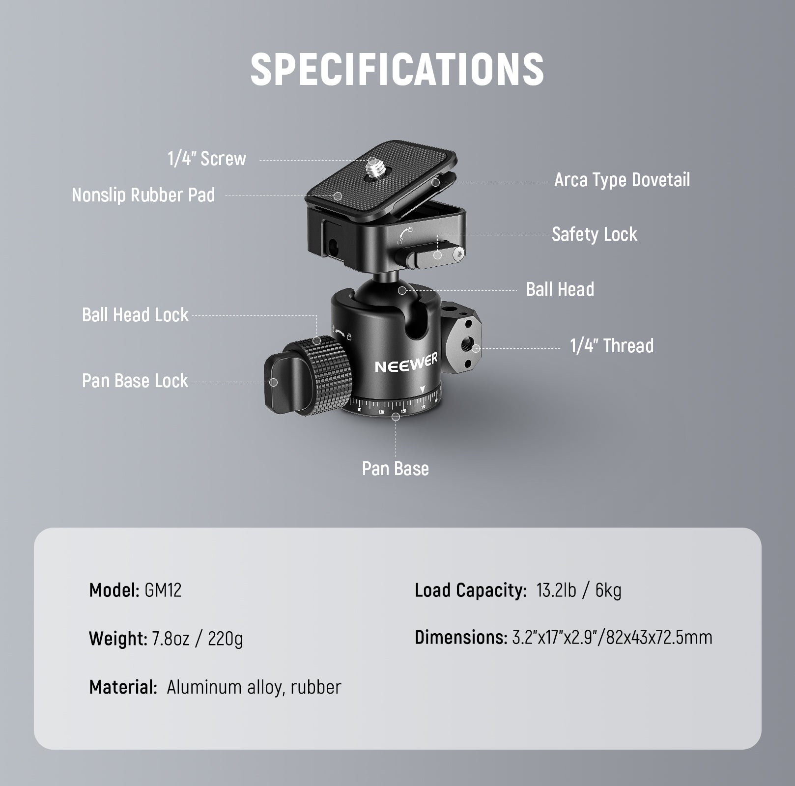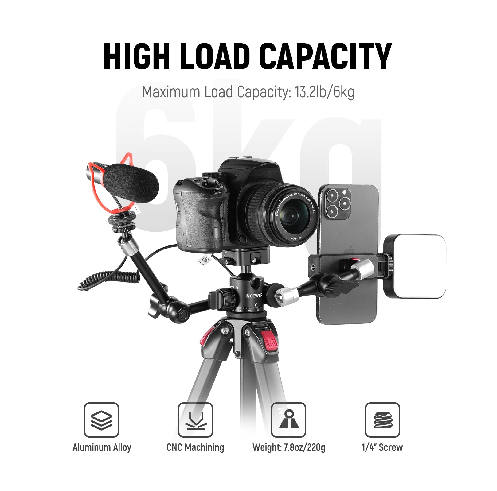 • Durable Structure & Package Contents- The ball head is made of premium aluminum alloy, processed with CNC machining for durability and low weight. It weighs only 7.8oz (220g), but boasts a load capacity of 13.2lb (6kg). Suitable for photography in the studio or on location, outdoor live streaming, interviewing, and capturing scenery at night