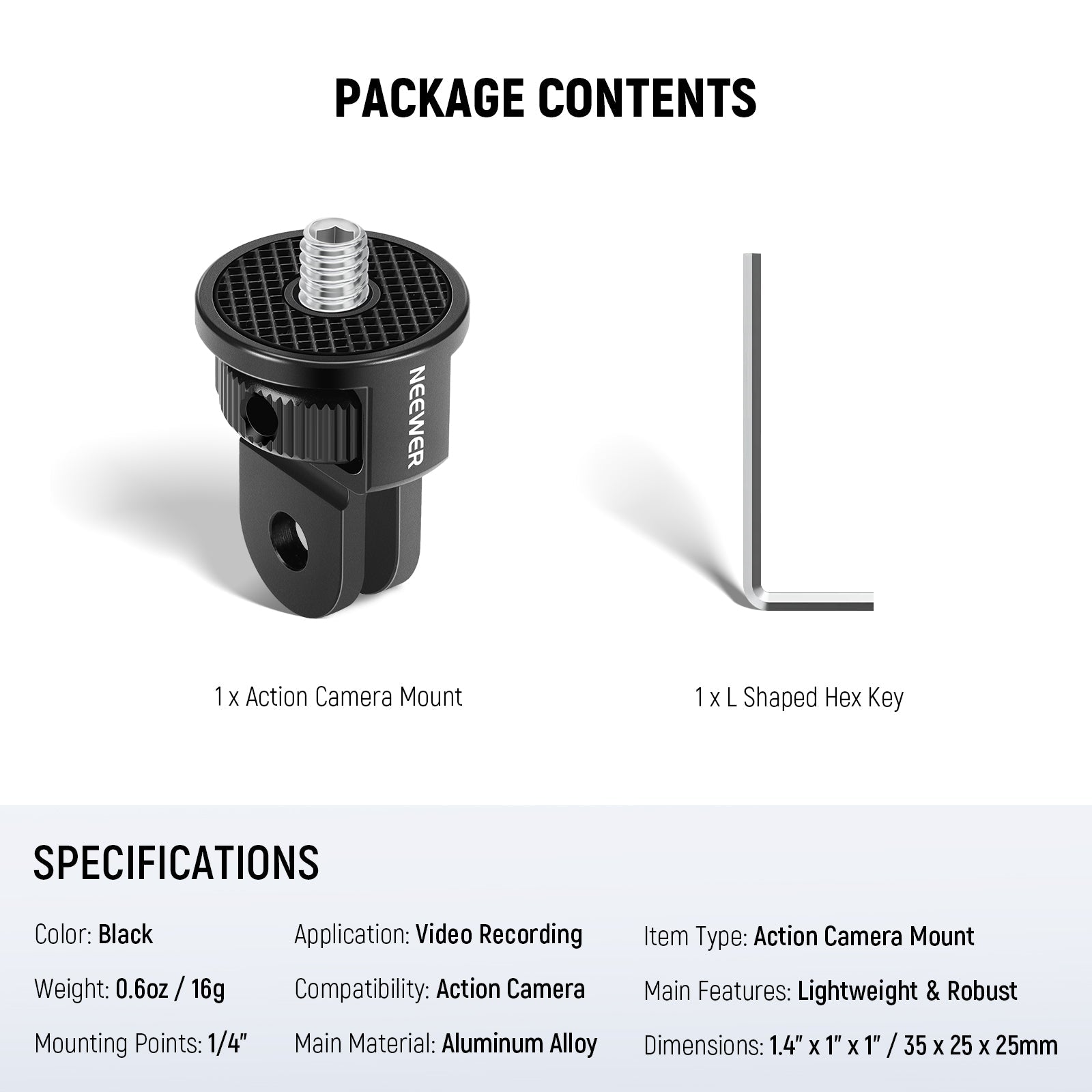 • Robust & Light Aluminum Alloy- Constructed from solid yet lightweight aluminum alloy, this mount is compact, portable, and designed to withstand all weather conditions (Dimensions: 1.4" x 1" x 1"/35 x 25 x 25mm, Weight: 0.6oz/16g)