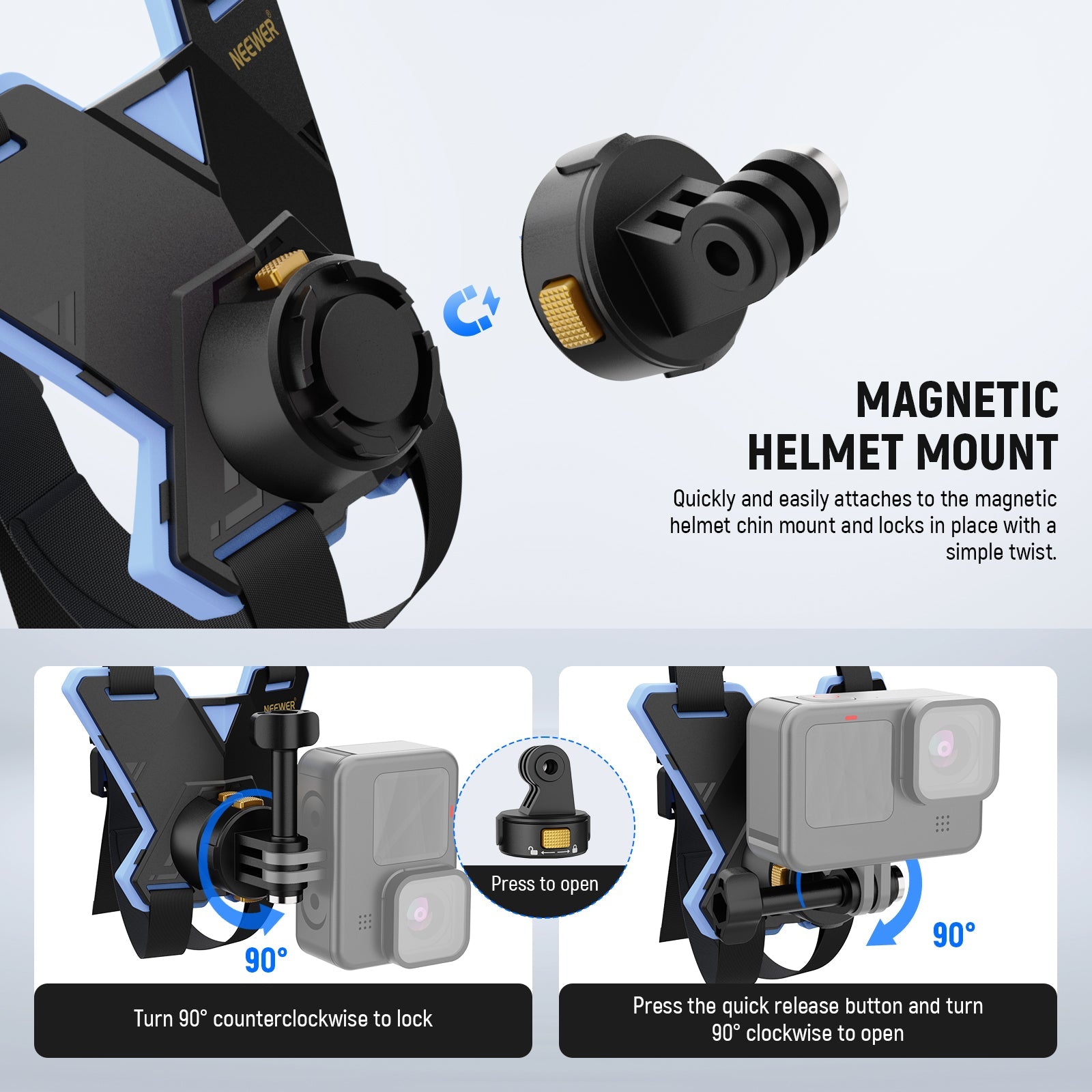 • For Action Cameras- GP19 motorcycle helmet chin photography holder accessories kit is compatible with GoPro Hero13 Hero 12 go pro 11 10 9 8 7 Black Max, compatible with DJI Osmo Action 5 Pro 4 3 2, compatible with Insta360 Go 3 2 Go 3S x4 x3 ONE R insta 360 Ace Pro, compatible with AKASO brave 8 7 4 combos, etc., by using the magnetic quick release mount adapter and an extra mount adapter with a 1/4" screw.  Also compatible with NEEWER Quick Release System (2nd generation)