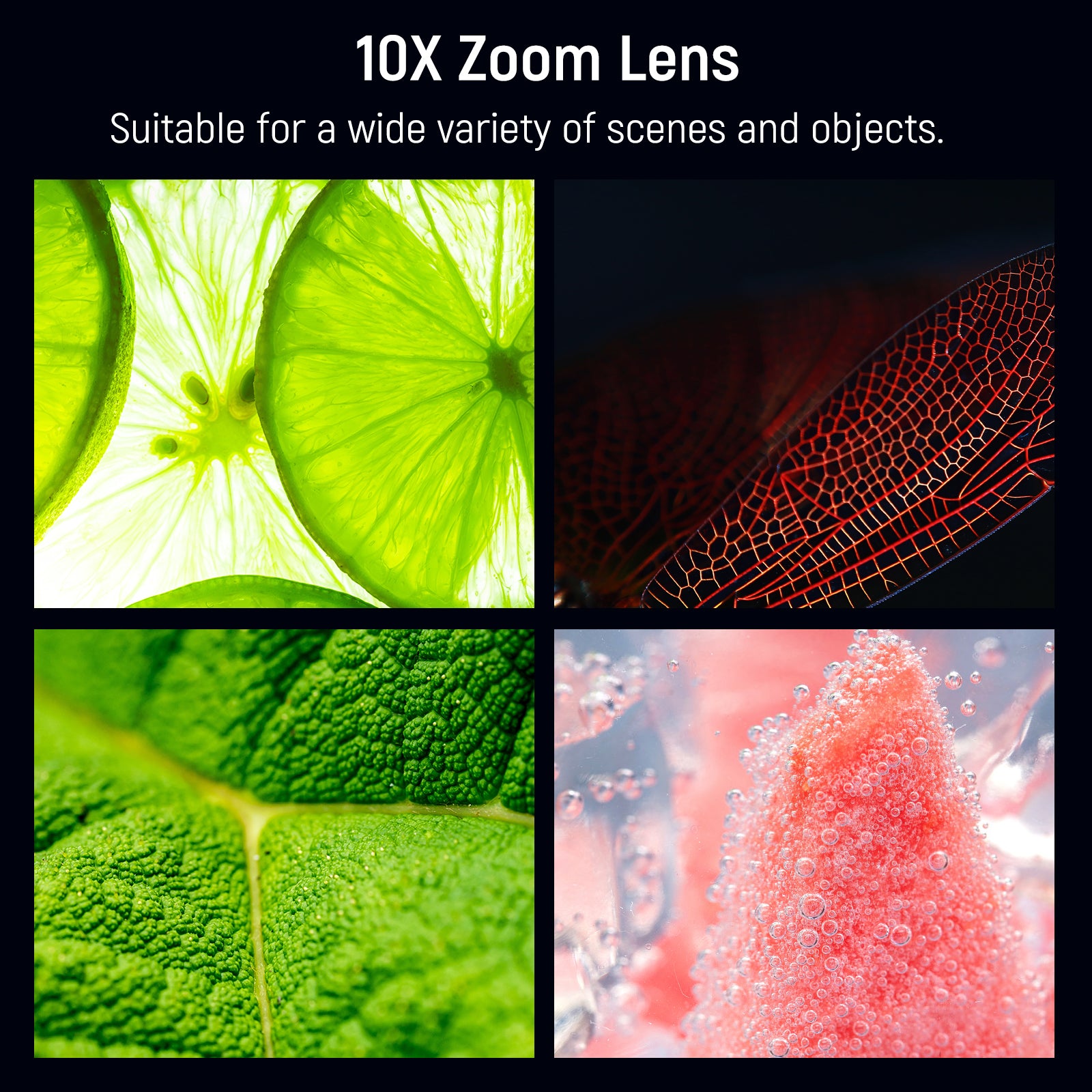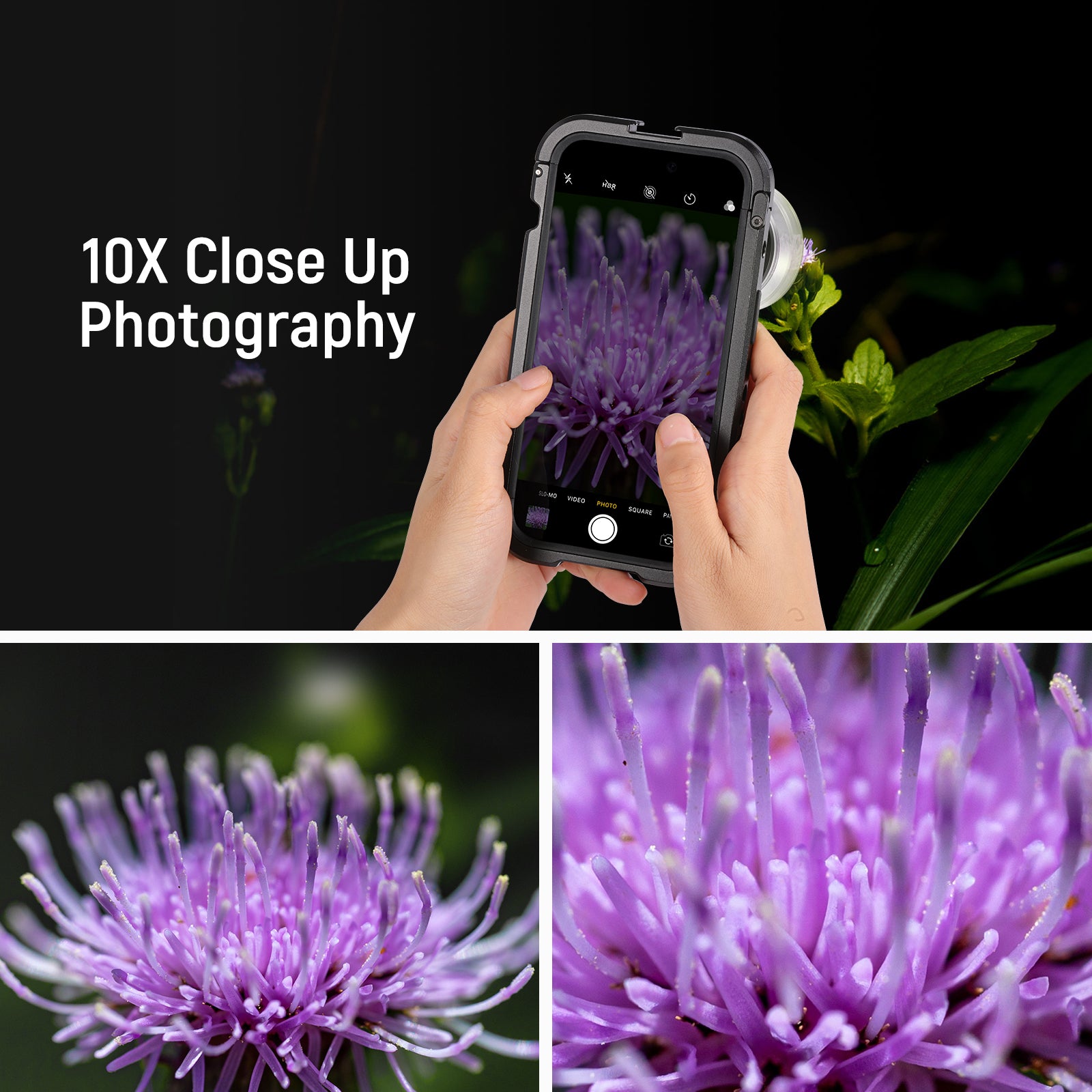 - 10X Macro Lens for Phone- Used on the main camera to take clear and sharp macro photos. With 10x magnification, this macro lens can reproduce the shallow depth of field of the human eye, allowing you to capture more details and achieve natural images with your phone