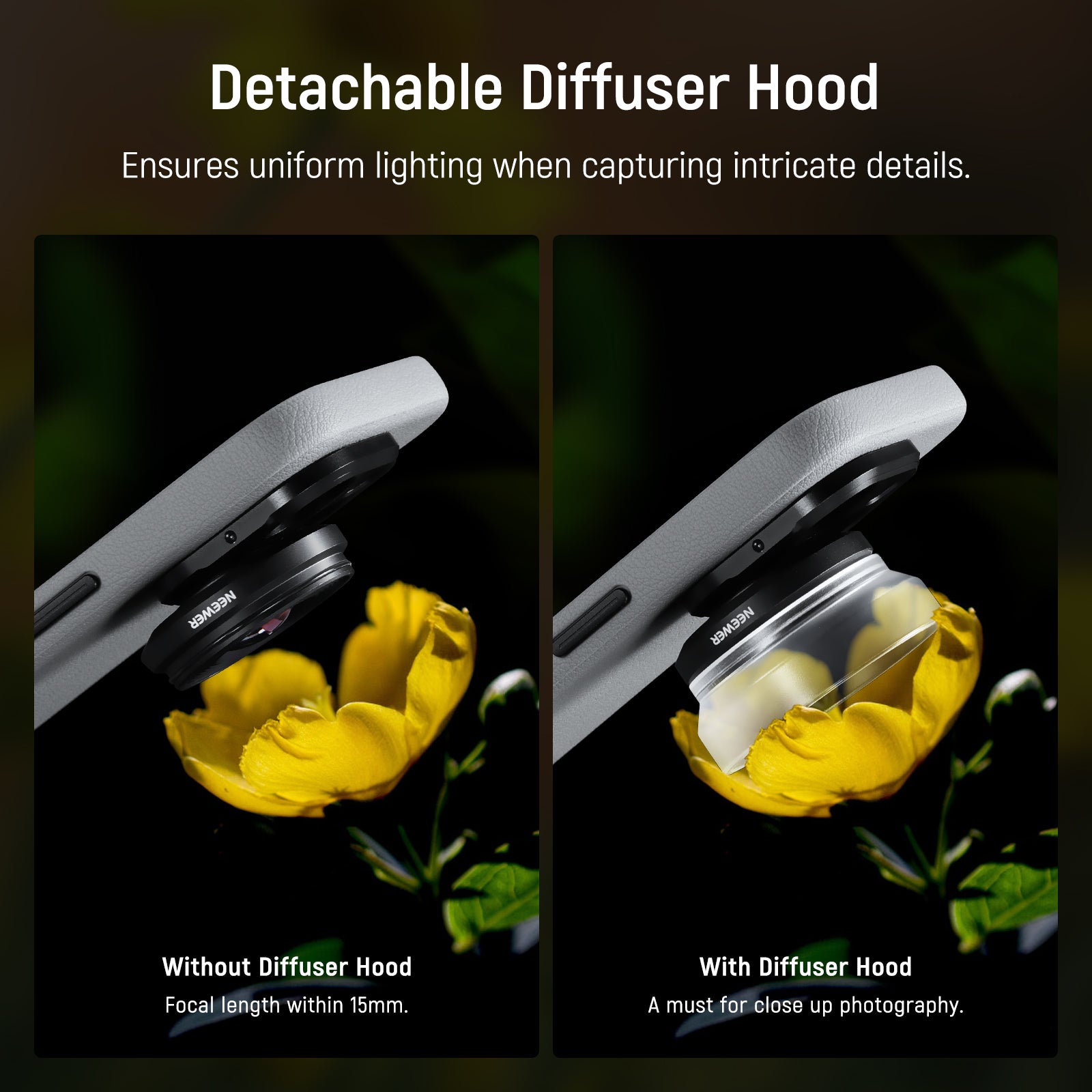 - Removable Diffuser- To achieve macro photography without shadows, we provide a removable soft diffuser to ensure even lighting when capturing tiny details. This accessory allows you to capture nuances that a bare phone lens can't do