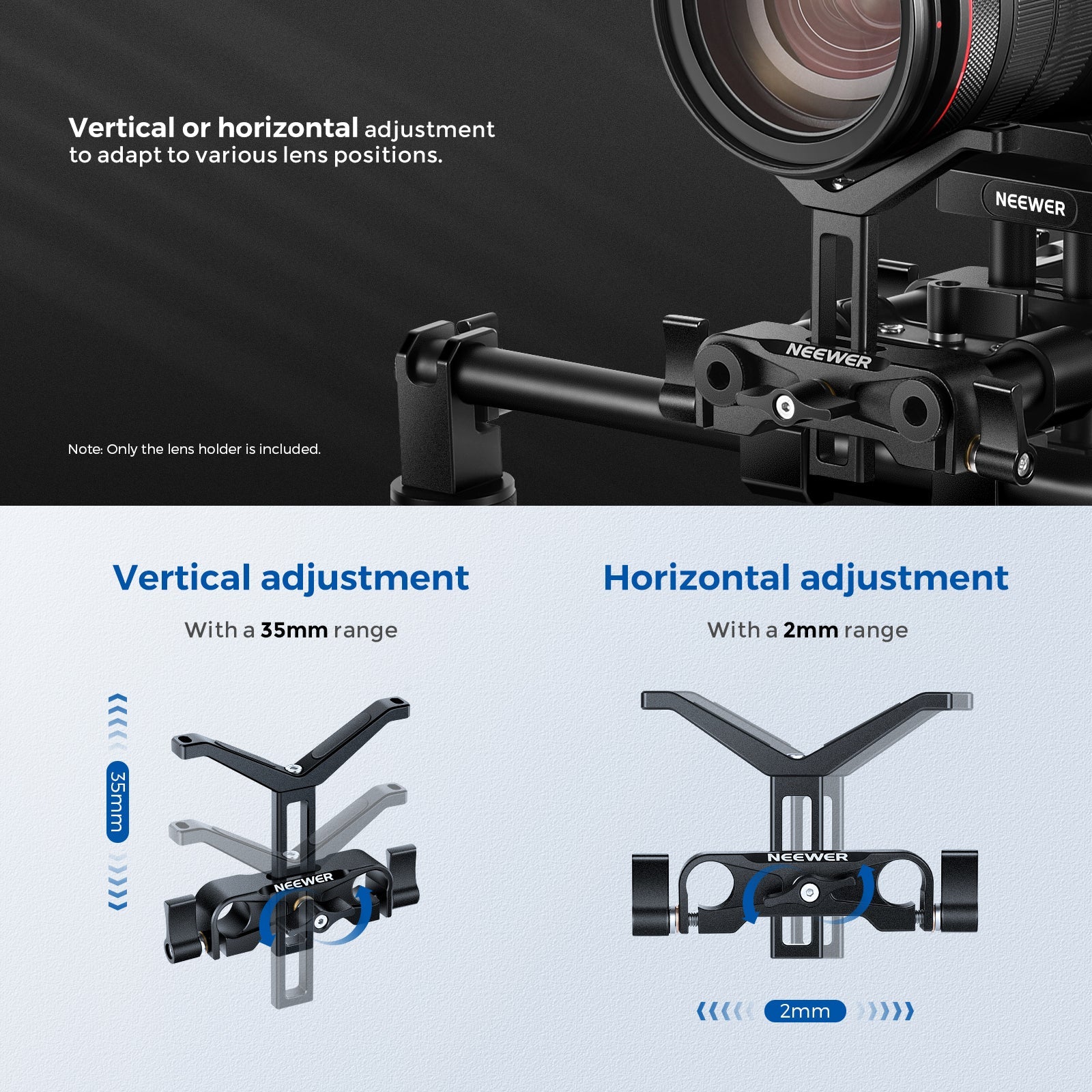 - 35/53mm vertical height adjustment fits lenses of various diameters. 2mm side-to-side adjustment for better lens support.