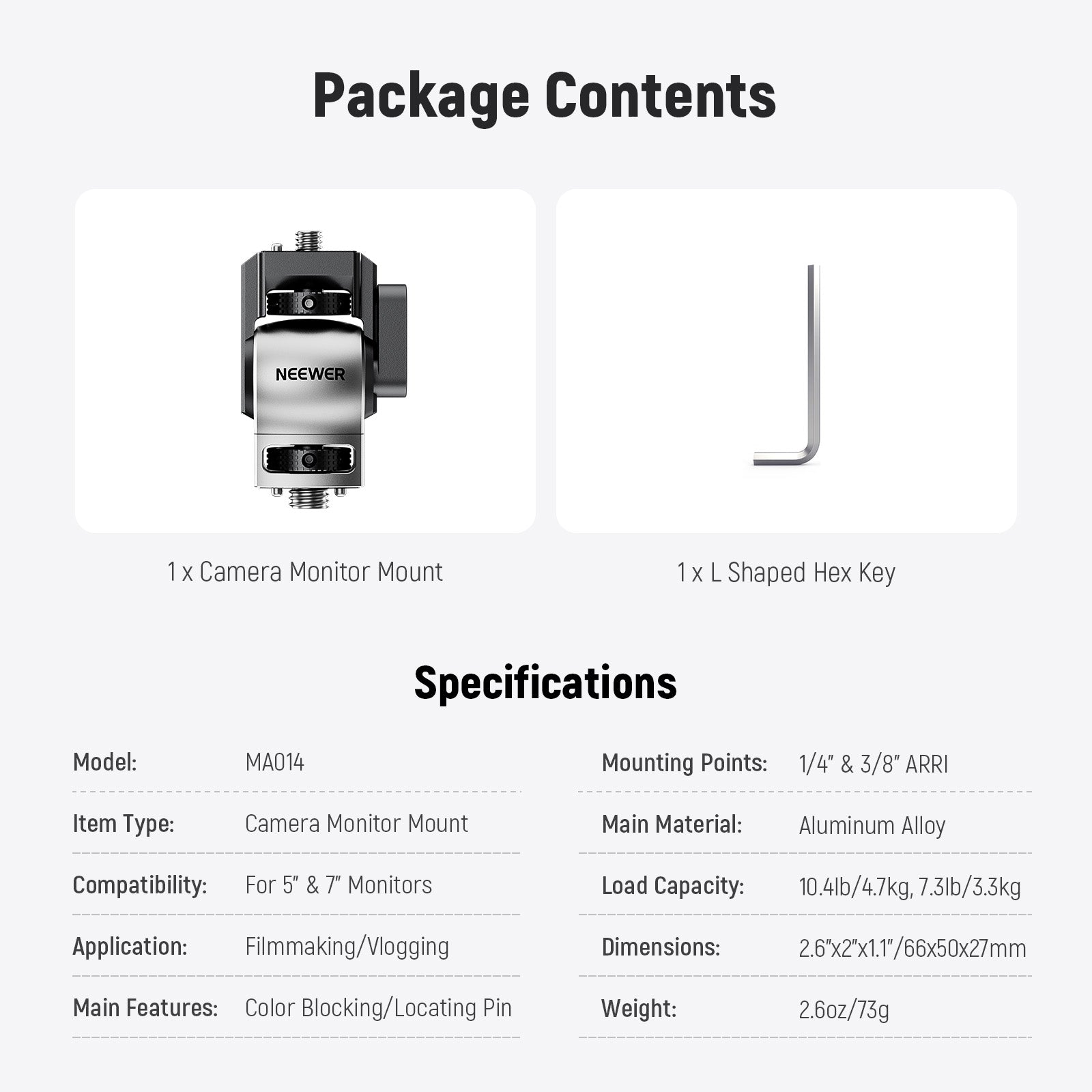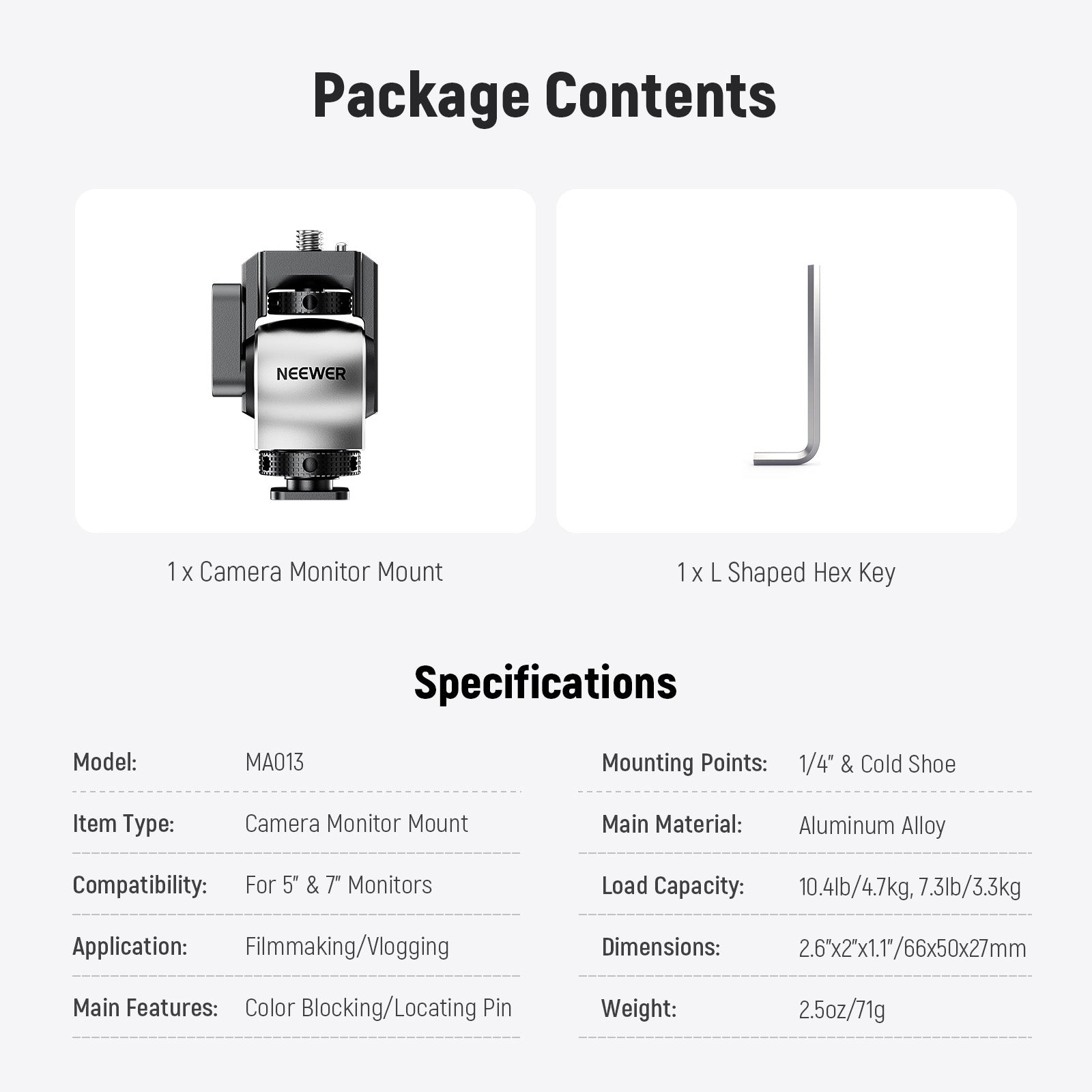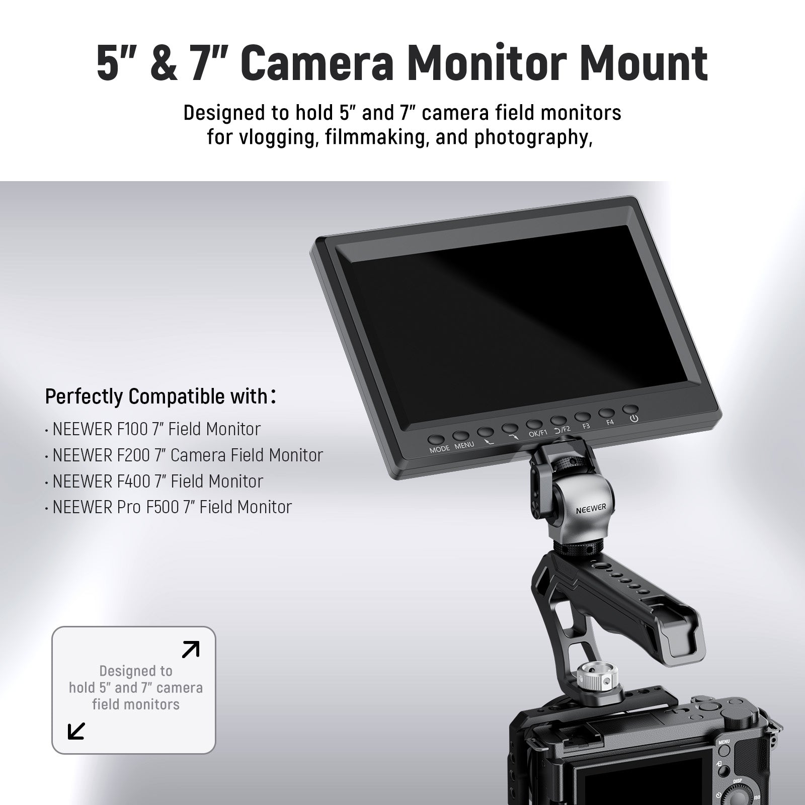 - 5" ~ 7" Camera Monitor Mount- Designed to hold 5" ~ 7" camera field monitors for vlogging, filmmaking, and photography, this field monitor mount with a cold shoe is compatible with SmallRig NEEWER camera cages, video rigs, top handles, side handles, gimbal sling handles and camera hot shoes. The silver and black color blocking aluminum alloy build is durable and stylish