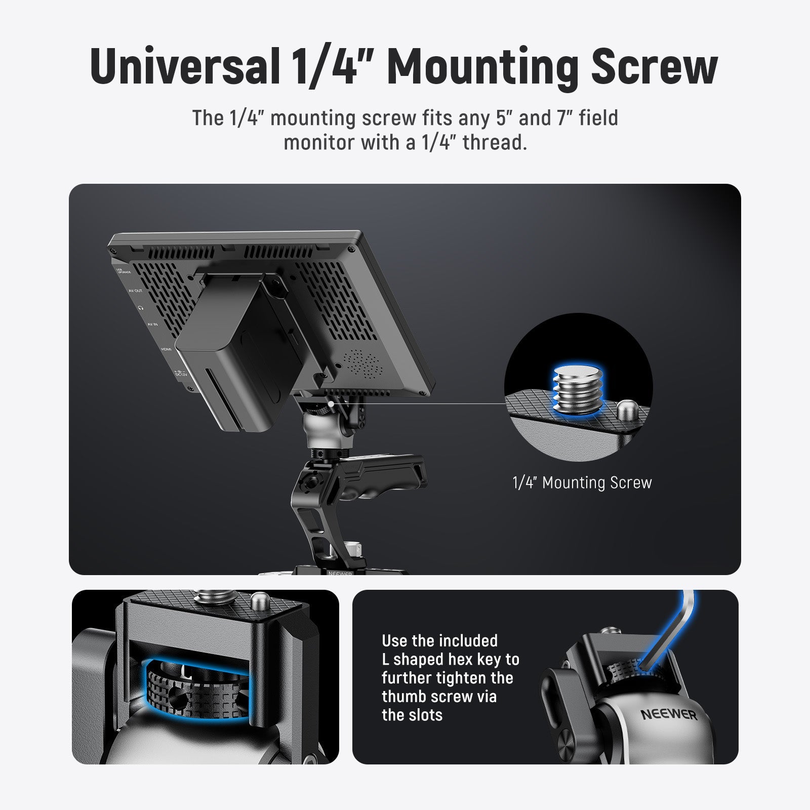 - Universal 1/4" Mounting Screw- The 1/4" mounting screw fits any 5" ~ 7" field monitor with a 1/4" thread. Use the hand tighten thumb screw for convenient mounting and the included L shaped hex key to further tighten the thumb screw via the slots