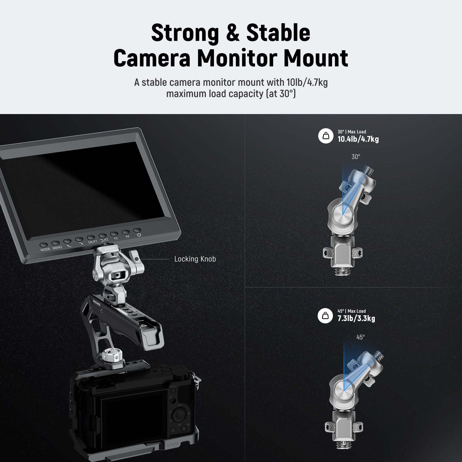 - Strong & Stable Camera Monitor Mount- A stable camera monitor mount with 10lb/4.7kg maximum load capacity (at 30°), it can securely support your field monitor for outdoor photography, location filming, and vlogging on the move