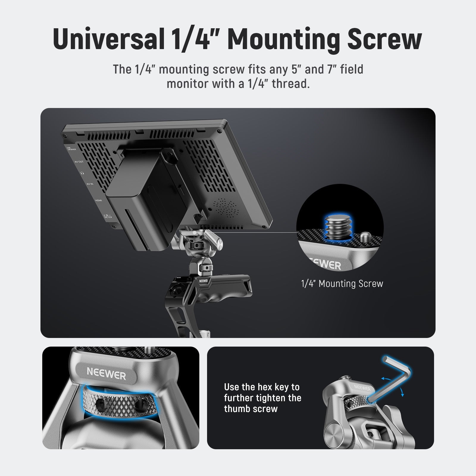 - 1/4" Mounting Screw with Anti Twist Pin- The retractable anti twist pin and rubber pad effectively prevent the monitor from deflecting. The 1/4" screw is compatible with NEEWER 5"-7" field monitors; compatible with SmallHD Focus OLED UltraBright 500 700; compatible with Atomos Ninja Shogun Flame; compatible with Blackmagic Design Video Assist 5" 4K 7"; compatible with Feelworld