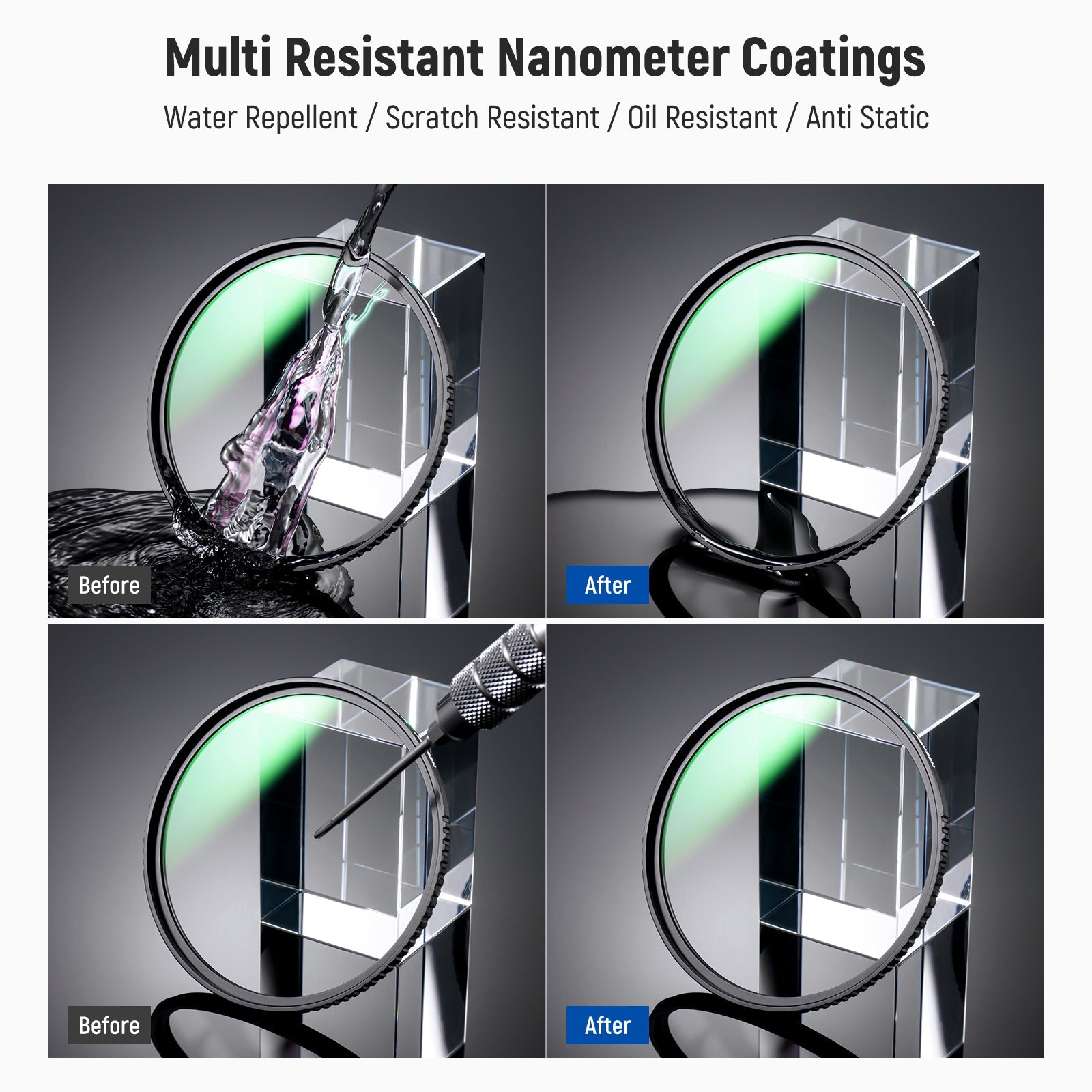 - Double-Sided Multiple Coatings- Crafted with 24 layers of Nano coatings on both sides, this UV filter reduces reflection and glare and is anti static, oil resistant, water-repellent, and scratch resistant