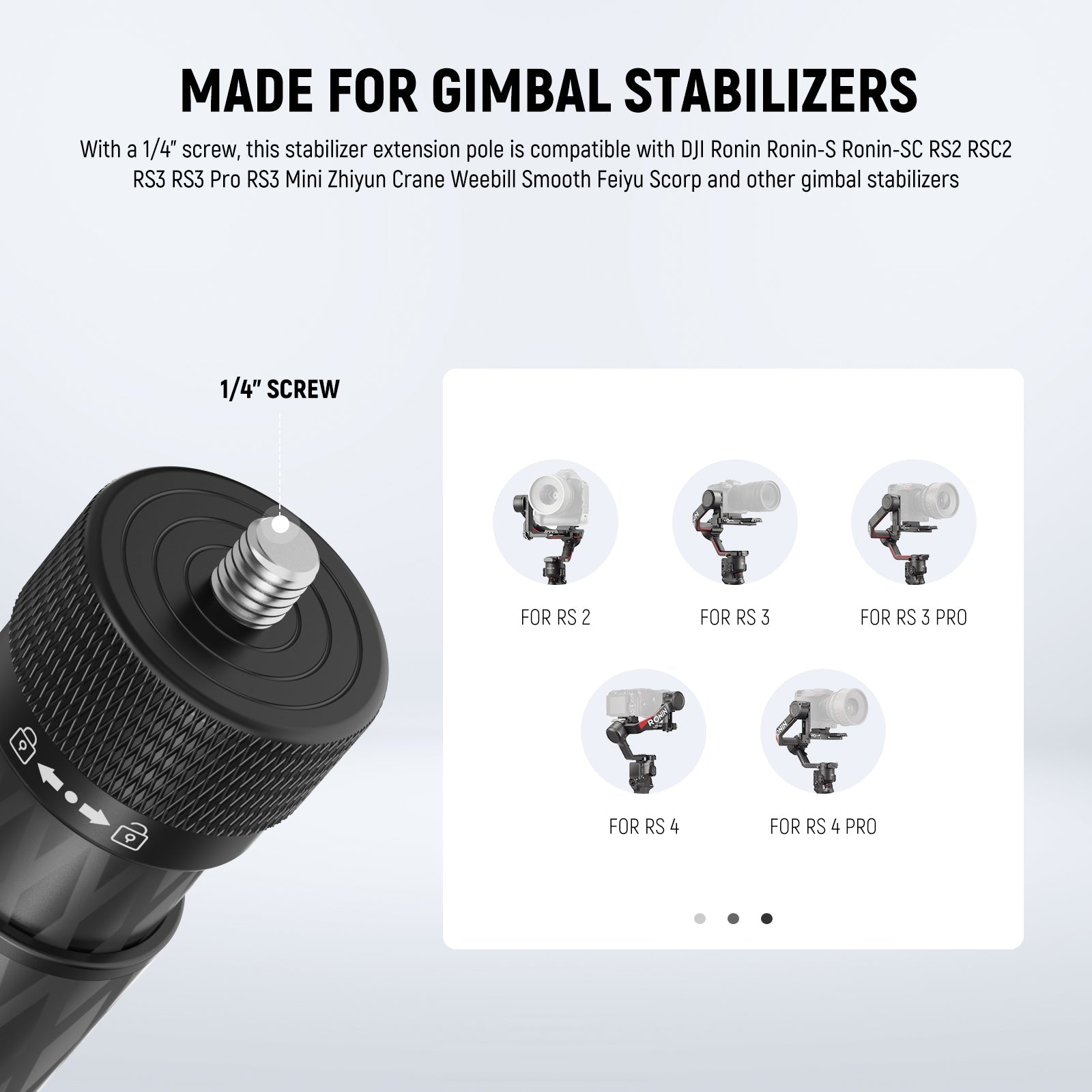 - Made for Gimbal Stabilizers- With a 1/4" screw, this stabilizer extension pole is compatible with DJI Ronin Ronin-S Ronin-SC RS2 RSC2 RS3 RS3 Pro RS3 Mini Zhiyun Crane Weebill Smooth Feiyu Scorp and other gimbal stabilizers