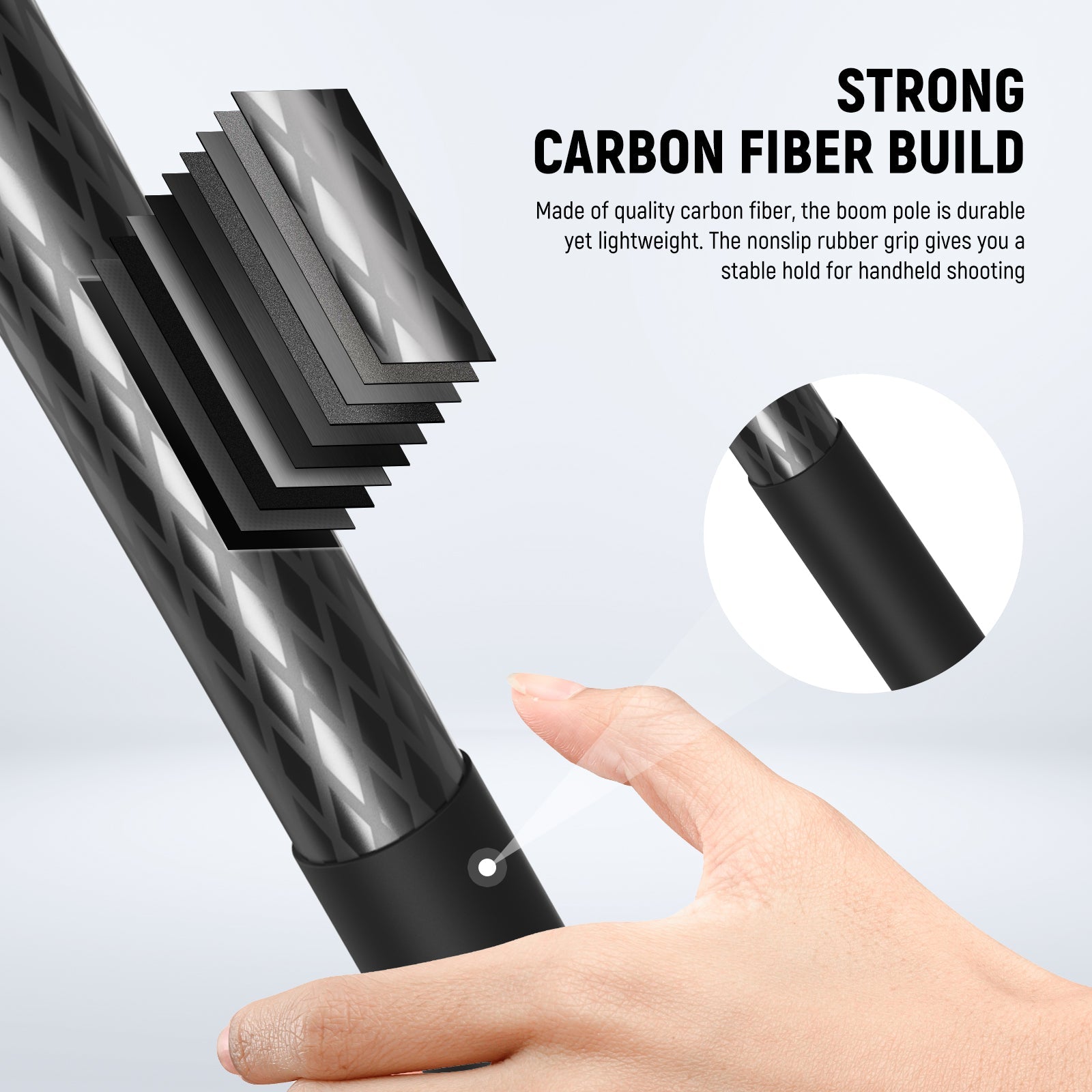 - Strong Carbon Fiber Build- Made of quality carbon fiber, the boom pole is durable yet lightweight. The nonslip rubber grip gives you a stable hold for handheld shooting