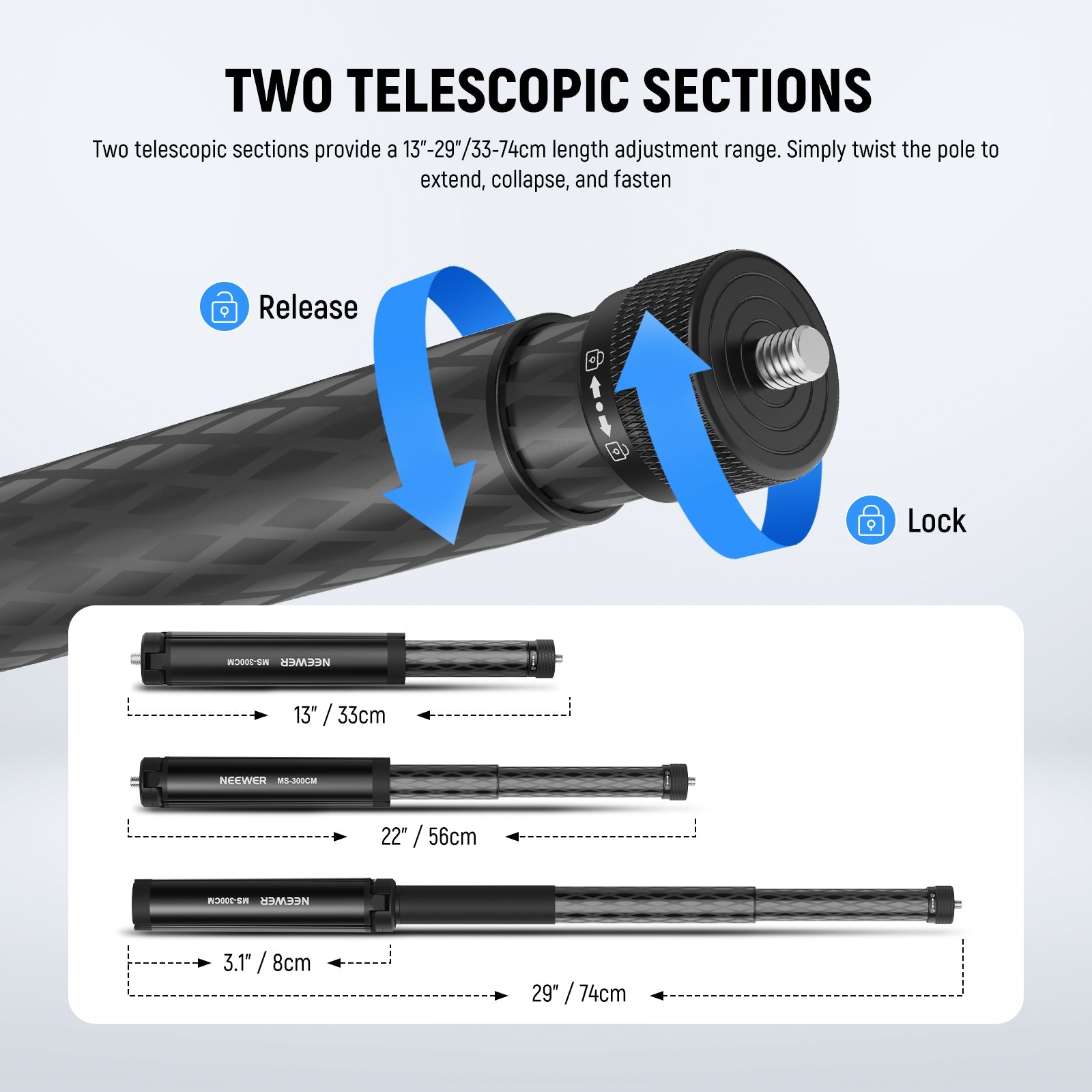 - Two Telescopic Sections- Two telescopic sections provide a 13"-29"/33-74cm length adjustment range. Simply twist the pole to extend, collapse, and fasten