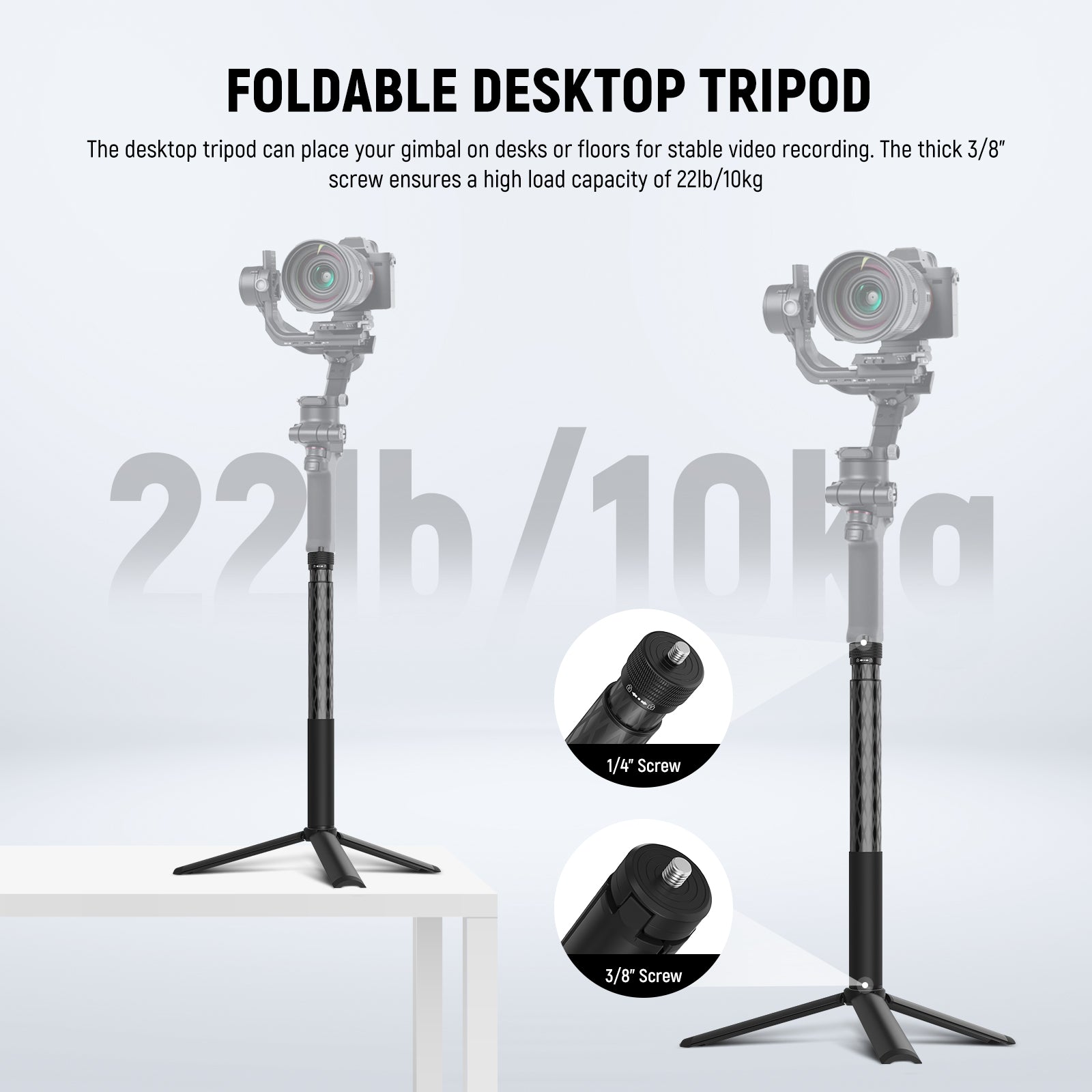- Foldable Desktop Tripod- The desktop tripod can place your gimbal on desks or floors for stable video recording. The thick 3/8" screw ensures a high load capacity of 22lb/10kg