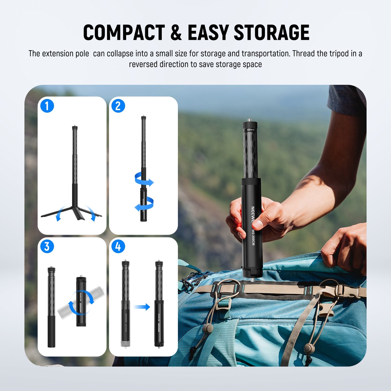 - Compact & Easy Storage- The extension pole can collapse into a small size for storage and transportation. Thread the tripod in a reversed direction to save storage space