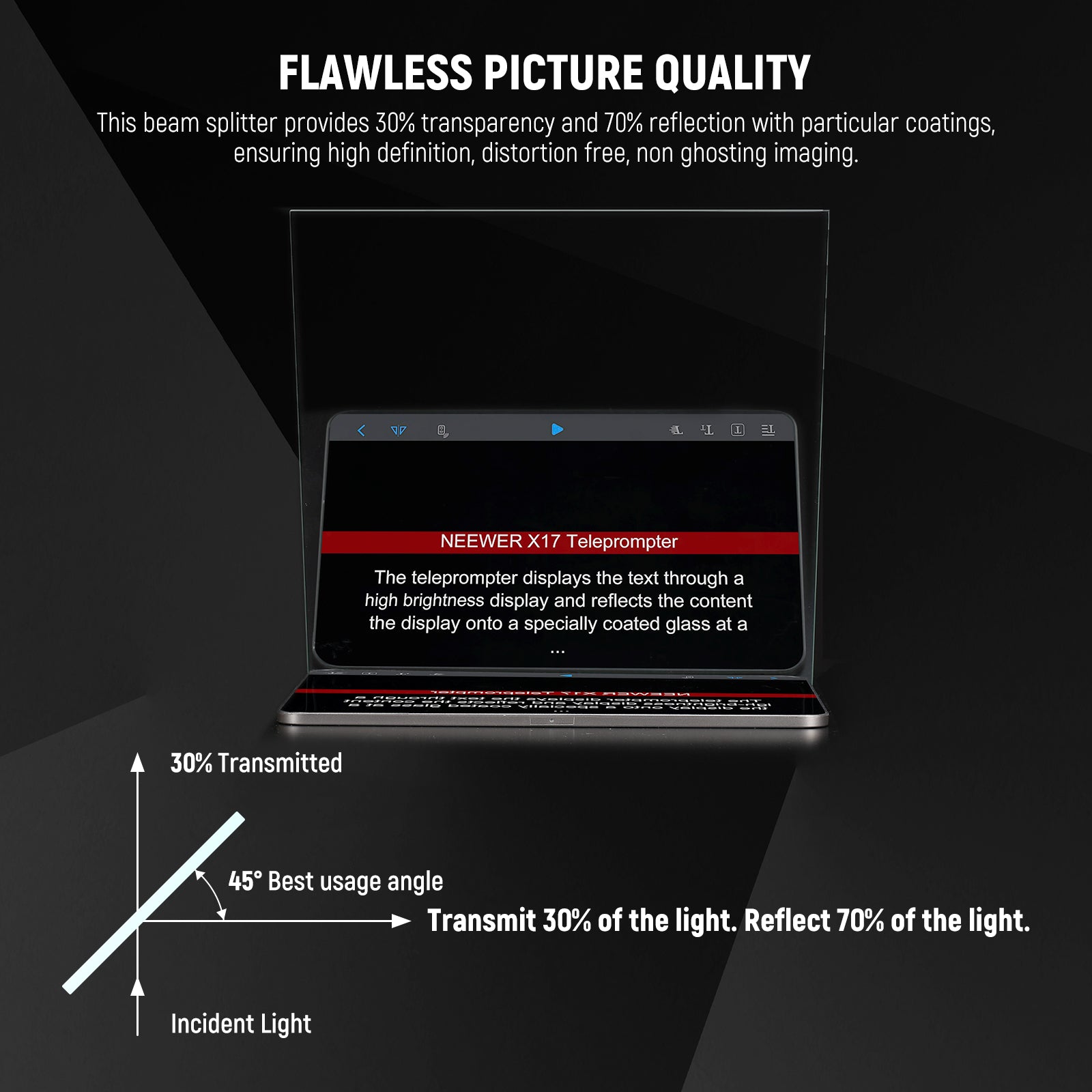 - Professional Teleprompter Glass- NEEWER HD cube beam splitter is constructed with ultimate craftsmanship for a crystal clear reflection. Its perfect 30T/70R visible light transmittance ensures clear information delivery while enabling effortless interaction with the audience, broadly used in video productions, education, e learning, live events, traditional newsrooms, television studios, etc. Note: beam splitter glass only; NOT compatible with NEEWER teleprompters