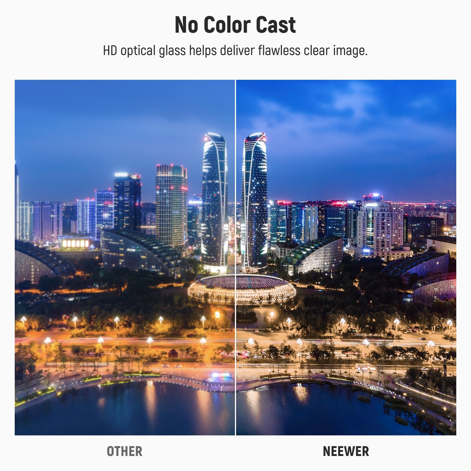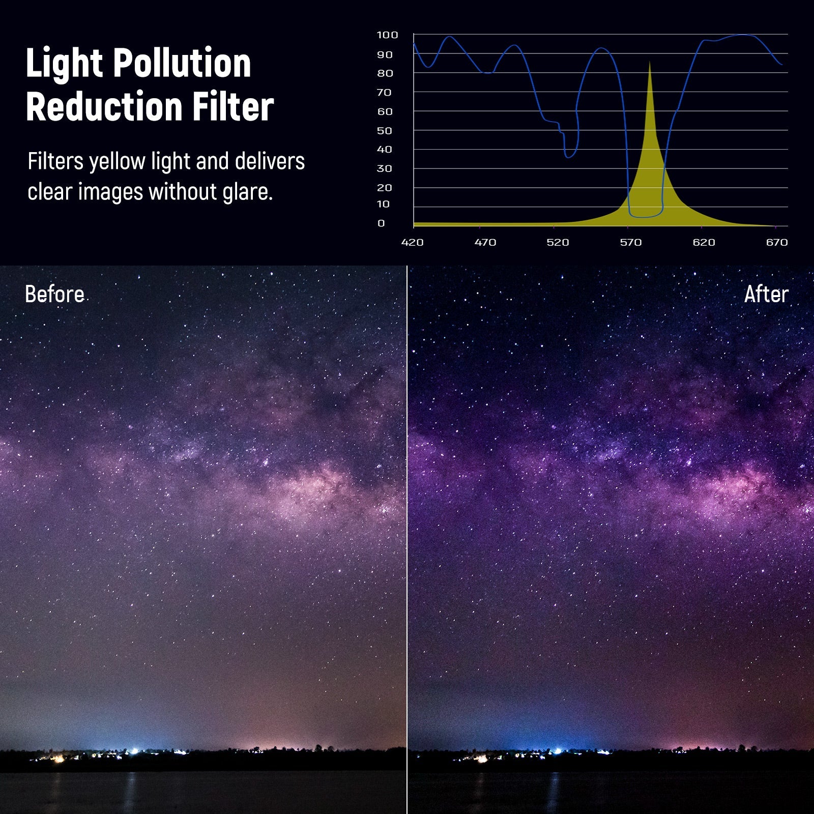 - Premium Natural Night Filter- When filming at night, light pollution from streetlamps, lights at home and business, neon signs, billboards, and other artificial lighting can be a real headache for photographers. Get this light pollution reduction filter to reduce the yellow/green color caused by city lights, capture details of your filming subject, keep proper contrasts, and avoid overexposure