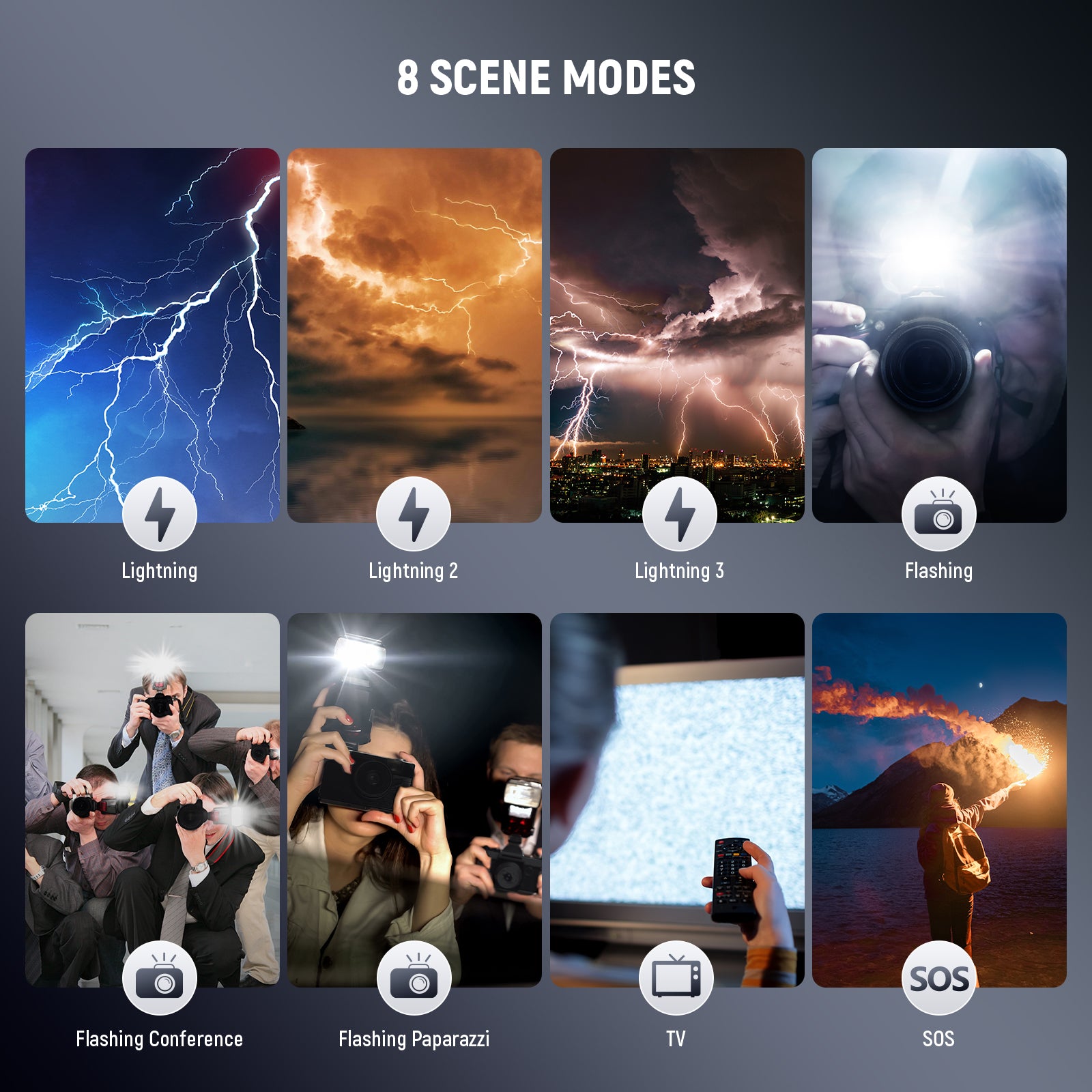 - 8 Scene Modes- There are 8 scene modes to meet different photography needs, including Lightning 1, Lightning 2, Lightning 3, Flash, Flash-Conference, Flash-Paparazzi, TV, and SOS. It is suitable for use as a short-distance fill light and is most effective when used within 2m