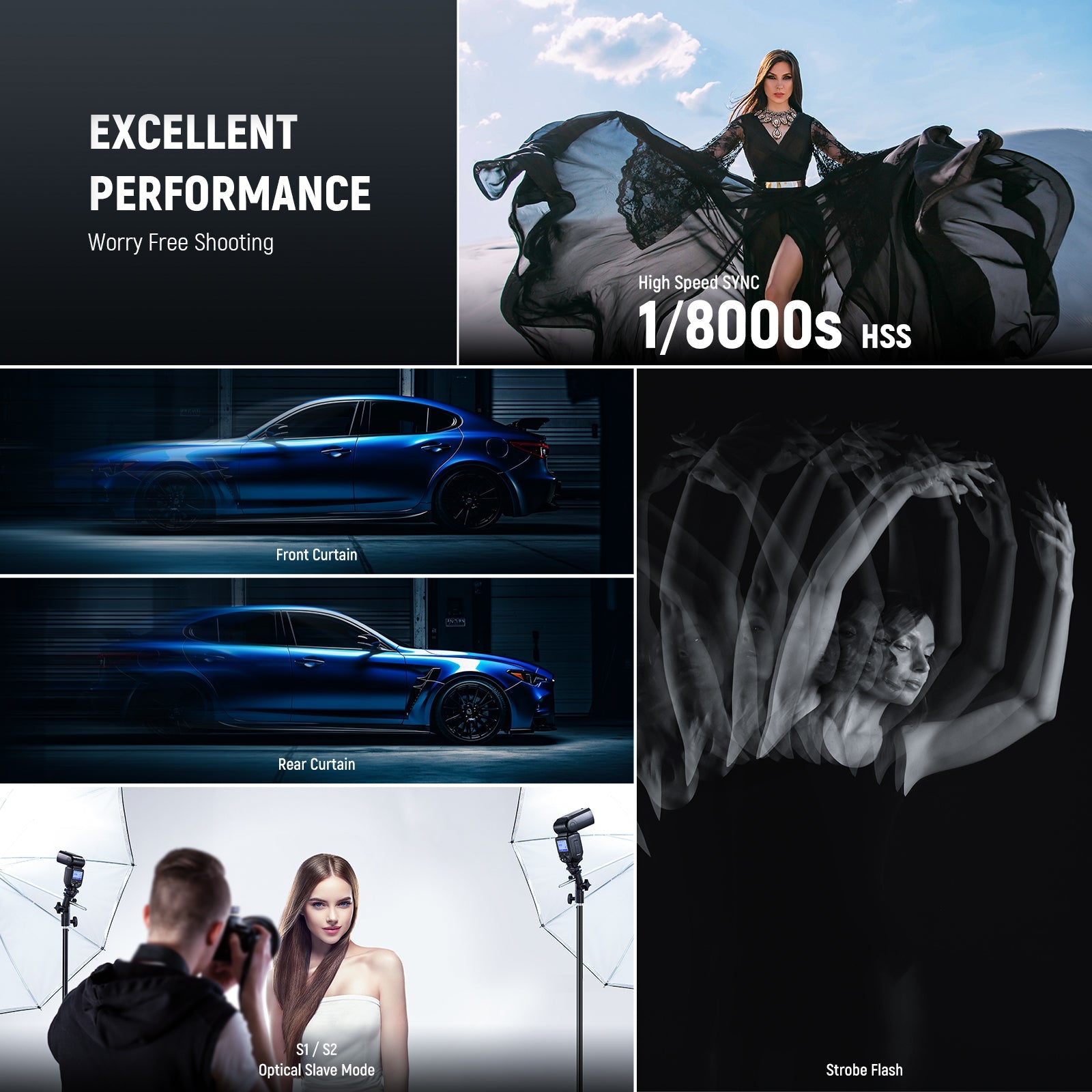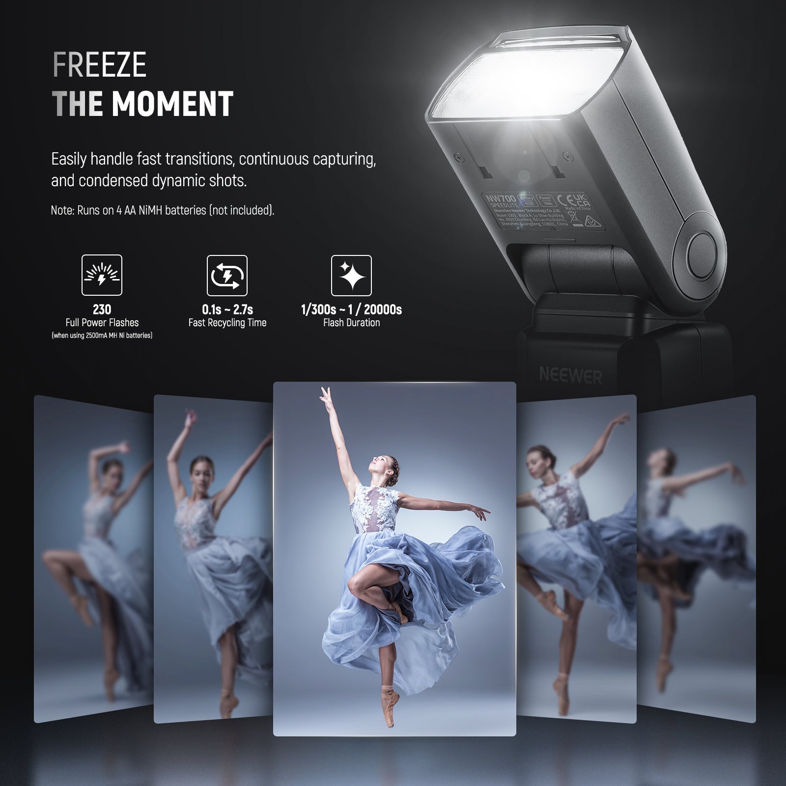 - High Performance with Dual Power Supply- With an added power port, the NW700-C can be powered not only by 4 AA MH-Ni batteries but also by the CP-E4 external power supply (both not included). Support 230 full power flashes, about 0.1-2.7s fast recycling, and 1/20000s flash duration (when using 2500mA MH-Ni batteries), so that photographers do not miss a shot. Can be remotely controlled by NEEWER FC-16 trigger (not included)
