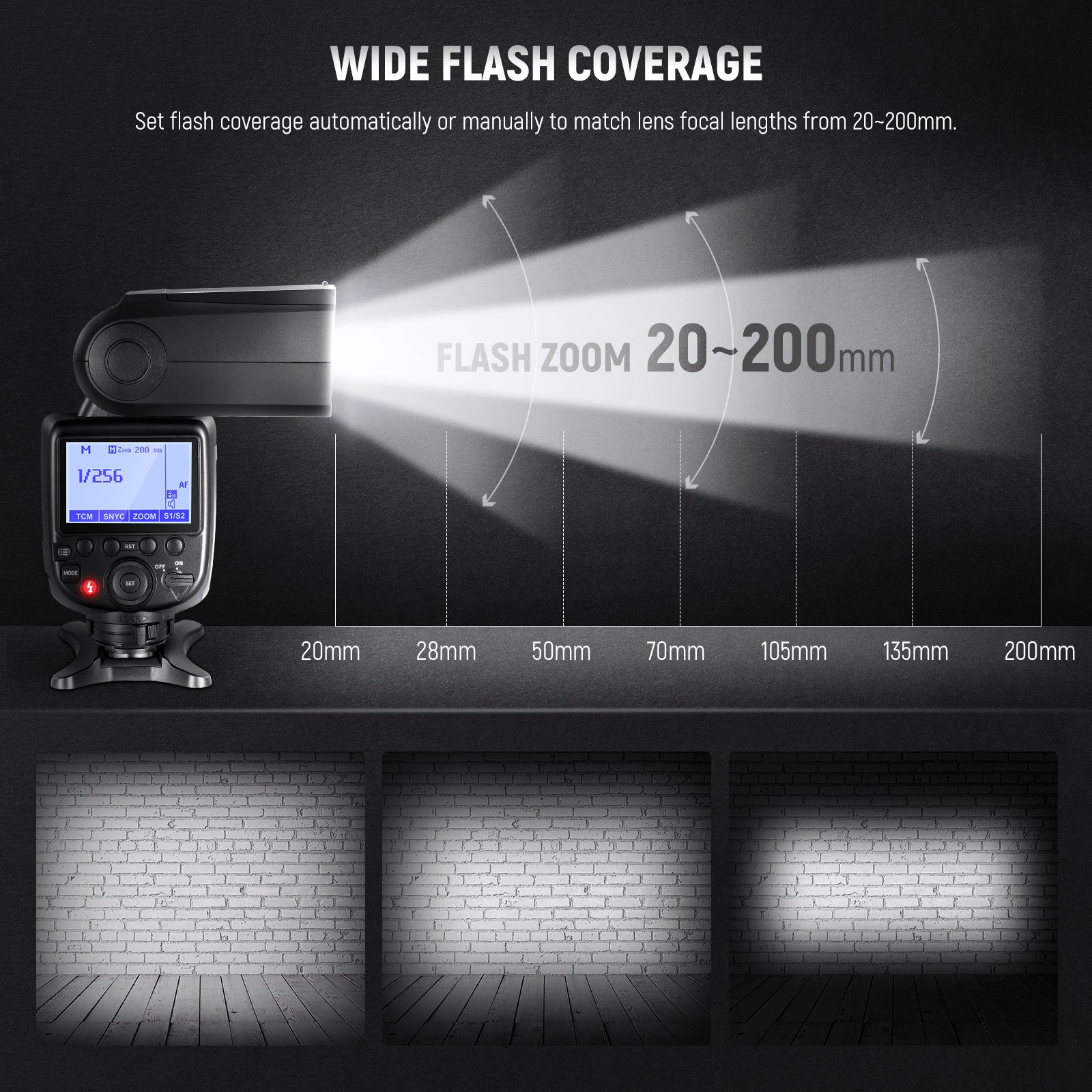 - Versatile & Multifunctional- Auto and manual zoom supported, the flash coverage ranges from 20mm to 200mm. Its flash is capable of titling -7° to 120° and panning 0 to 360° to easily realize bounce flash, short distance photography, and more. The included wide angle diffuser and catchlight panel help soften lighting and reflect light into the subject’s eyes. NW700-C also includes an LCD display, USB Type C firmware grade port, and other custom functions like auto power off