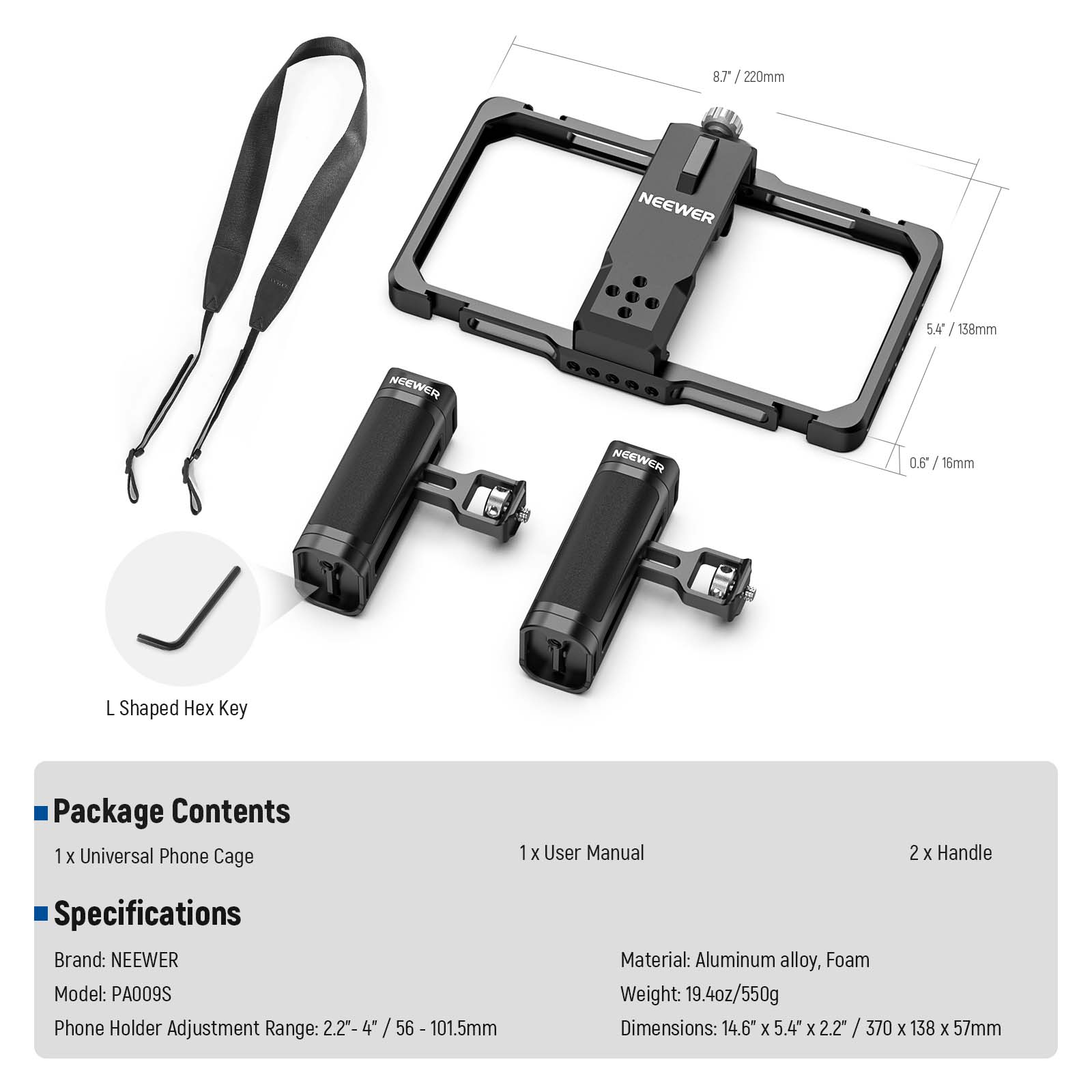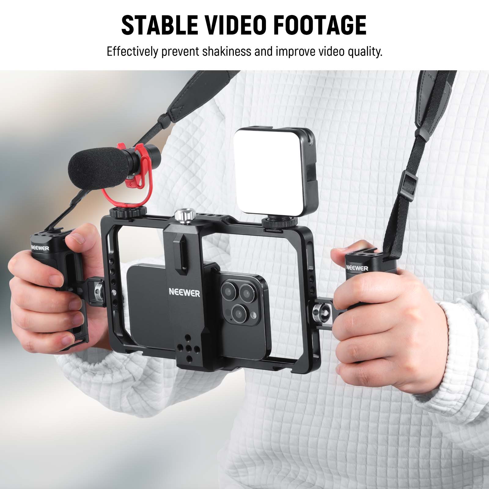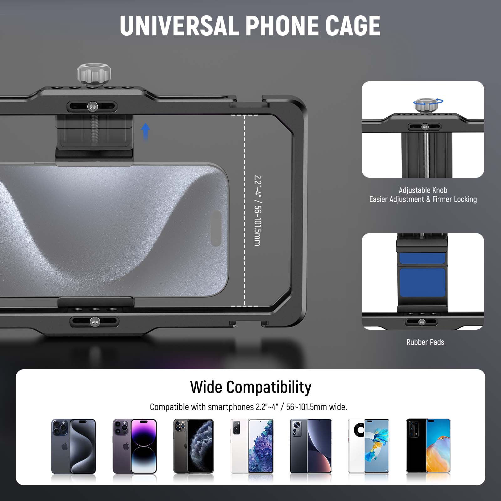 - Universal Phone Video Rig Kit- The upgraded anti drop phone video recording equipment is laterally movable and 2.2"-4"/56-101.5mm adjustable, compatible with iPhone 16 15 Pro Max Plus 14 13 Mini 12 11 Samsung Galaxy S24 S23 S22 Ultra Google Pixel 9 8 7 Pro and other android mobile phones. The cell phone holder secures the phone with a fixing knob for handheld shooting. Ideal for social media content creators, influencers, video makers, movie makers, youtubers, vloggers, etc.