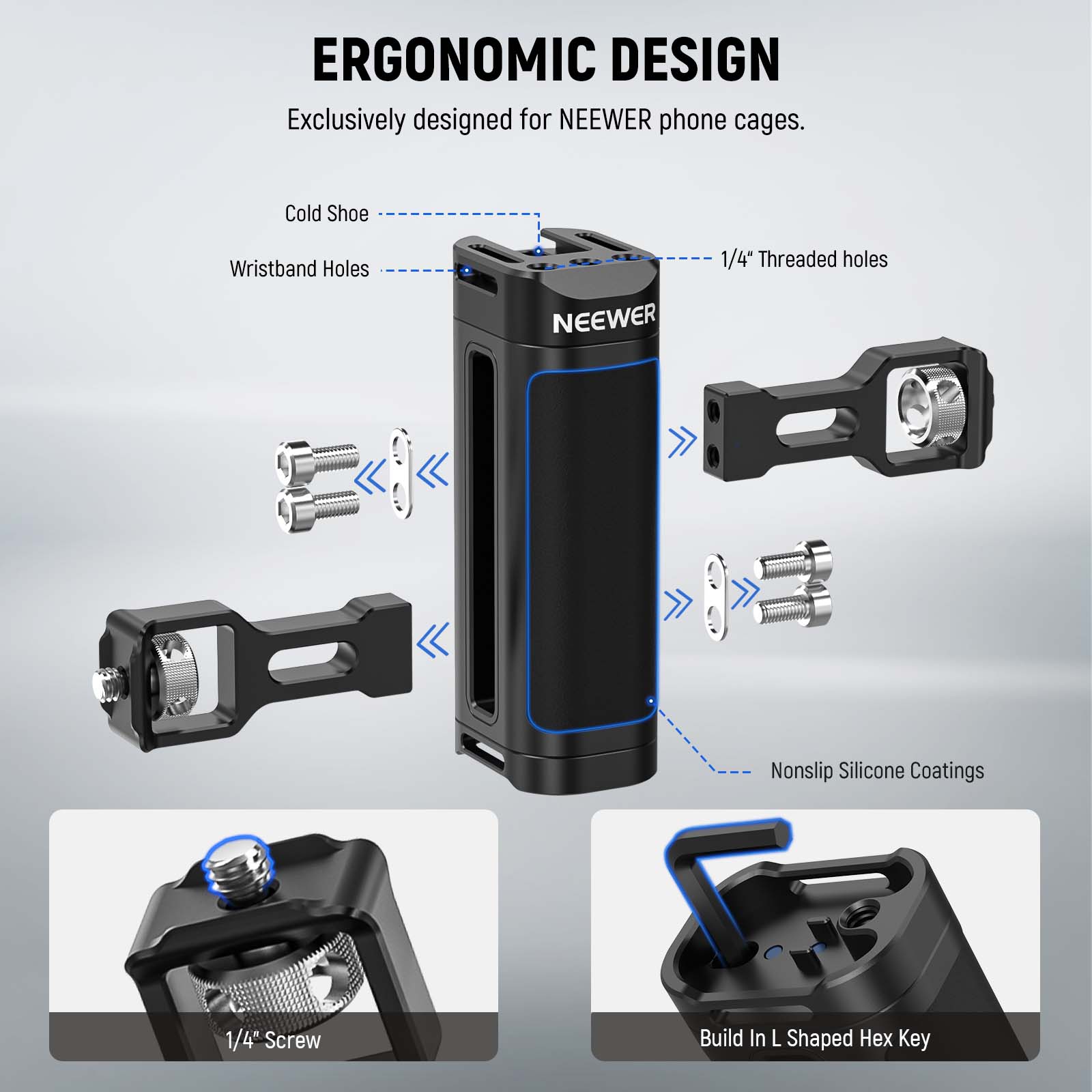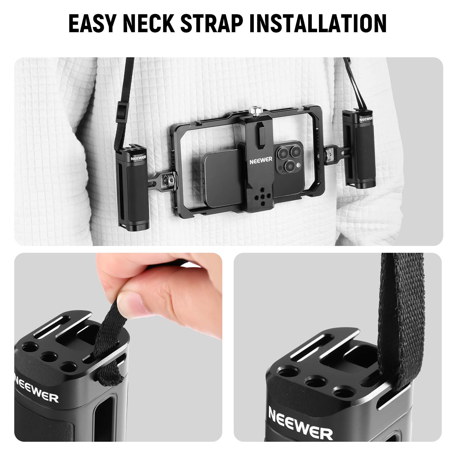 - Handgrips & Neck Shoulder Strap- Dual handles attach to the cage by thumbscrews with a trapezoidal interface design for maximum stability, and the foam coating provides a stable and comfortable hold for filming (An L shaped hex key helps adjust positions upwards or downwards for optimal balancing). You can tie the shoulder strap through the strap slots of the handle for muscle stress relief and improved stability