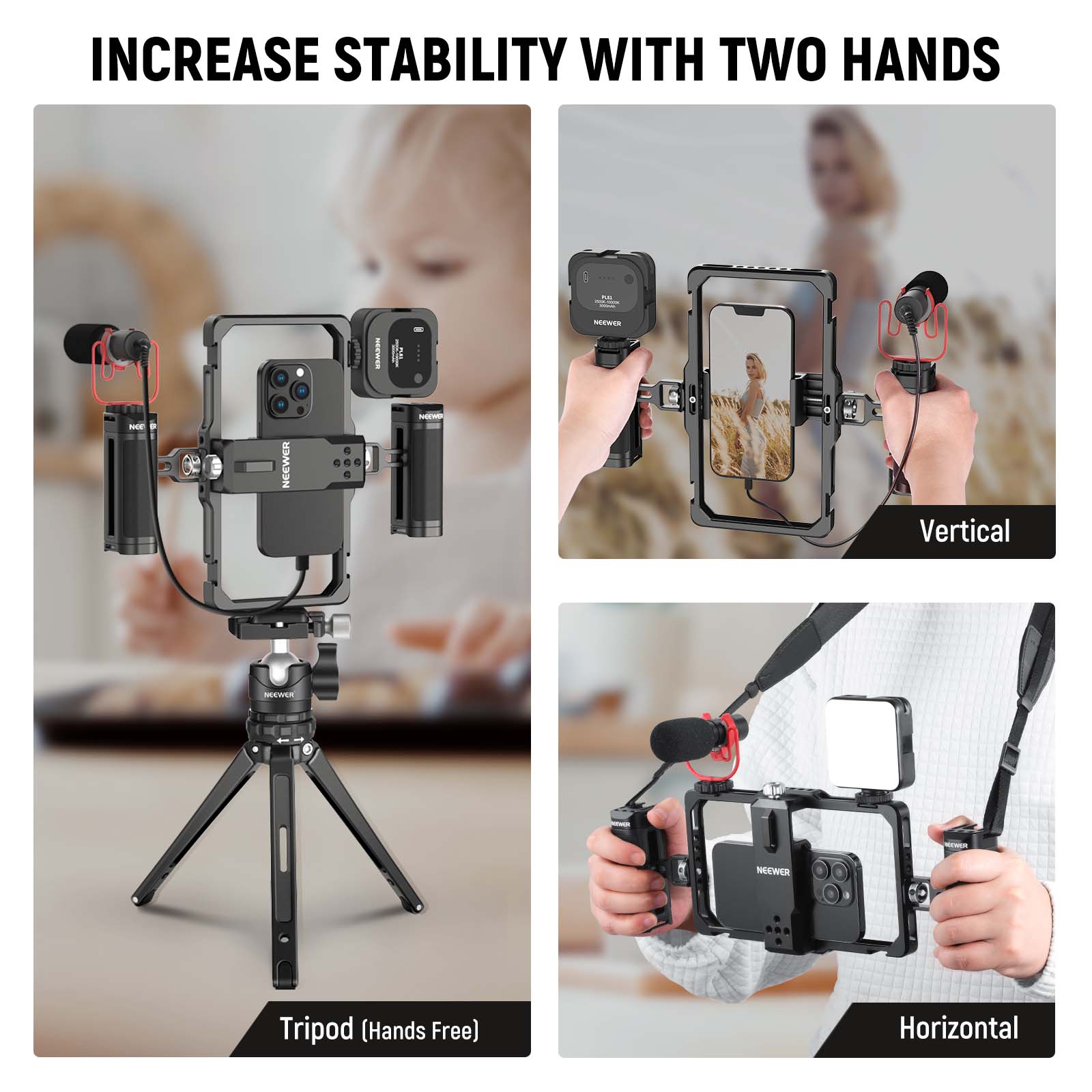 - Vertical/Horizontal Mounting- 1/4" threads on the bottom and the sides of phone rig can connect the cage to a tripod, desktop tripod, monopod, and handgrip in vertical or horizontal orientations