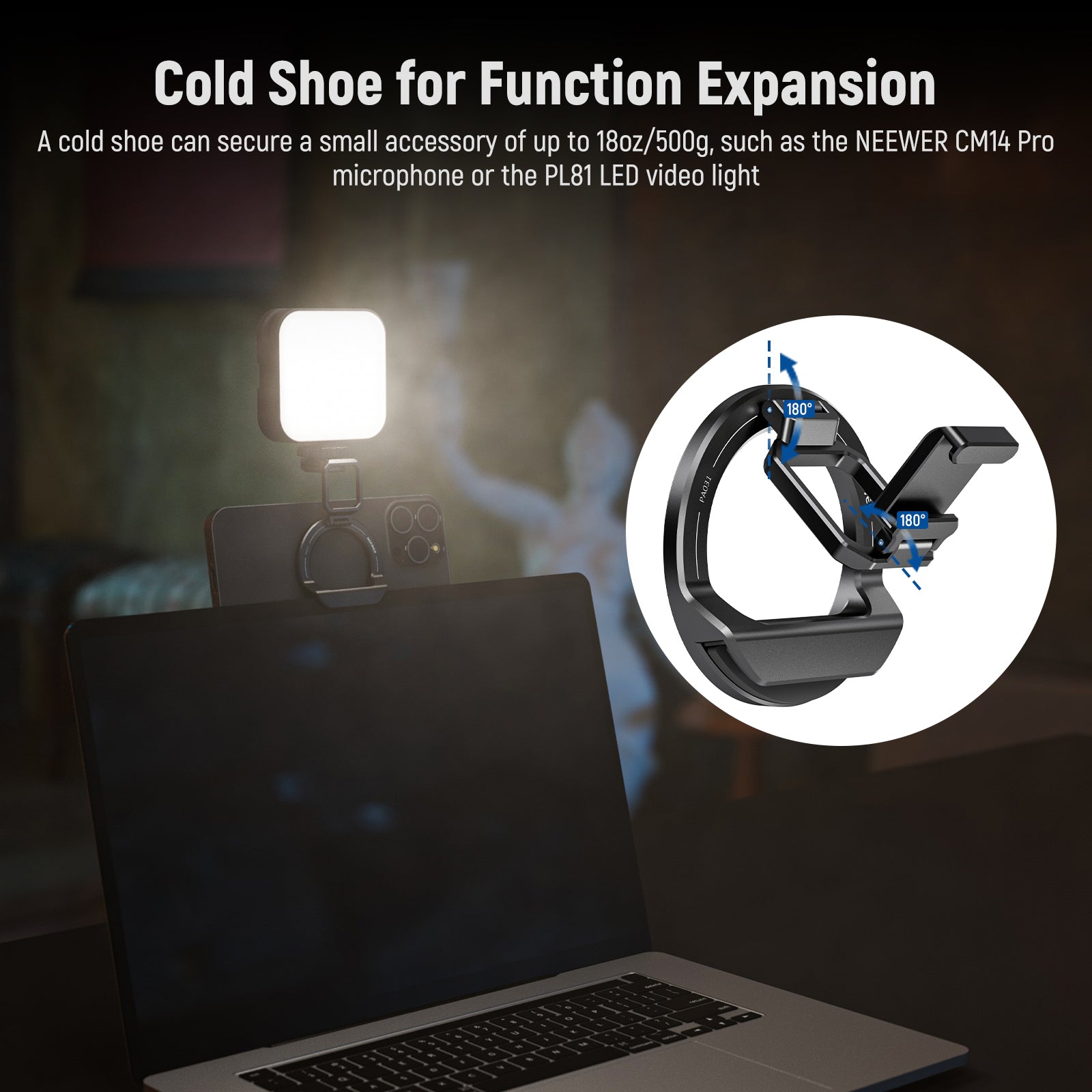 - Cold Shoe for Function Expansion- A cold shoe can secure a small accessory of up to 18oz/500g, such as the NEEWER CM14 Pro microphone or the PL81 LED video light, for Zoom calls, online courses, live streaming, and video conferencing. It also doubles as a desktop phone kickstand for video watching