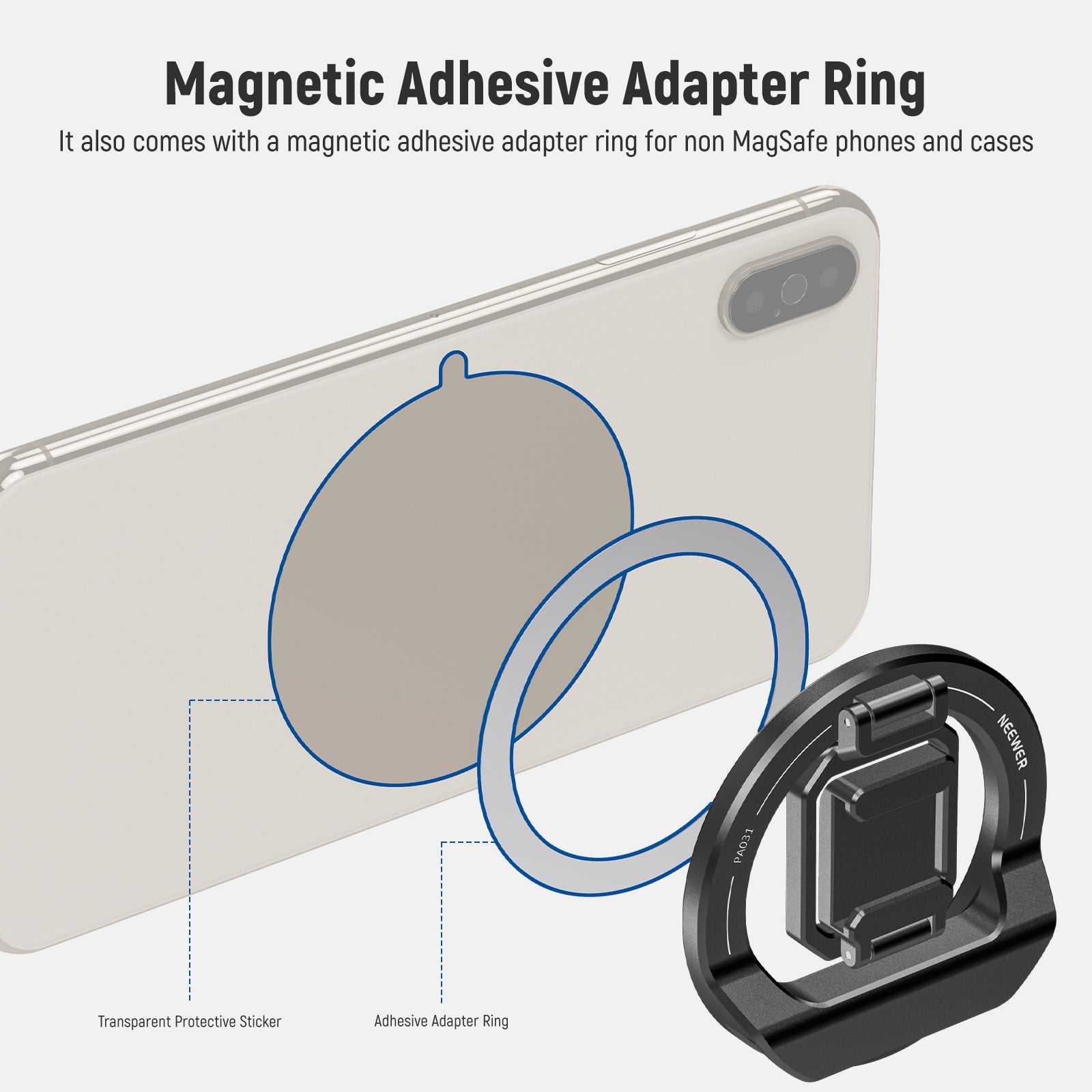 - Magnetic Adhesive Adapter Ring- For phones and cases not compatible with MagSafe, you can stick the provided magnetic adhesive adapter ring on them first, then attach this webcam mount