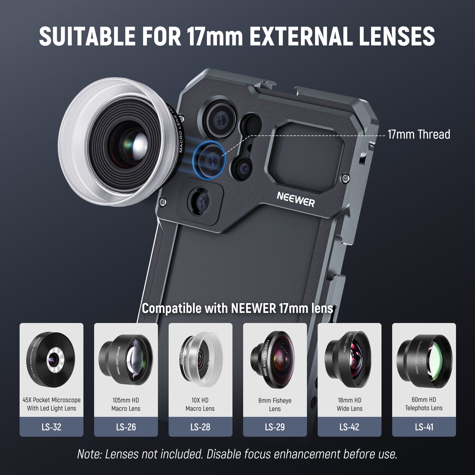 • Suitable for 17mm External Lenses- Only suitable for 17mm thread phone lens attachments, compatible with Kase 17mm thread macro lens telephoto lens, compatible with NEEWER 17mm thread 10X macro phone lens LS-28, 105mm macro phone lens LS-26, 8mm fisheye wide angle lens LS-29, 300X microscope close up lens, or 6X telephoto lens (all lenses are not included)