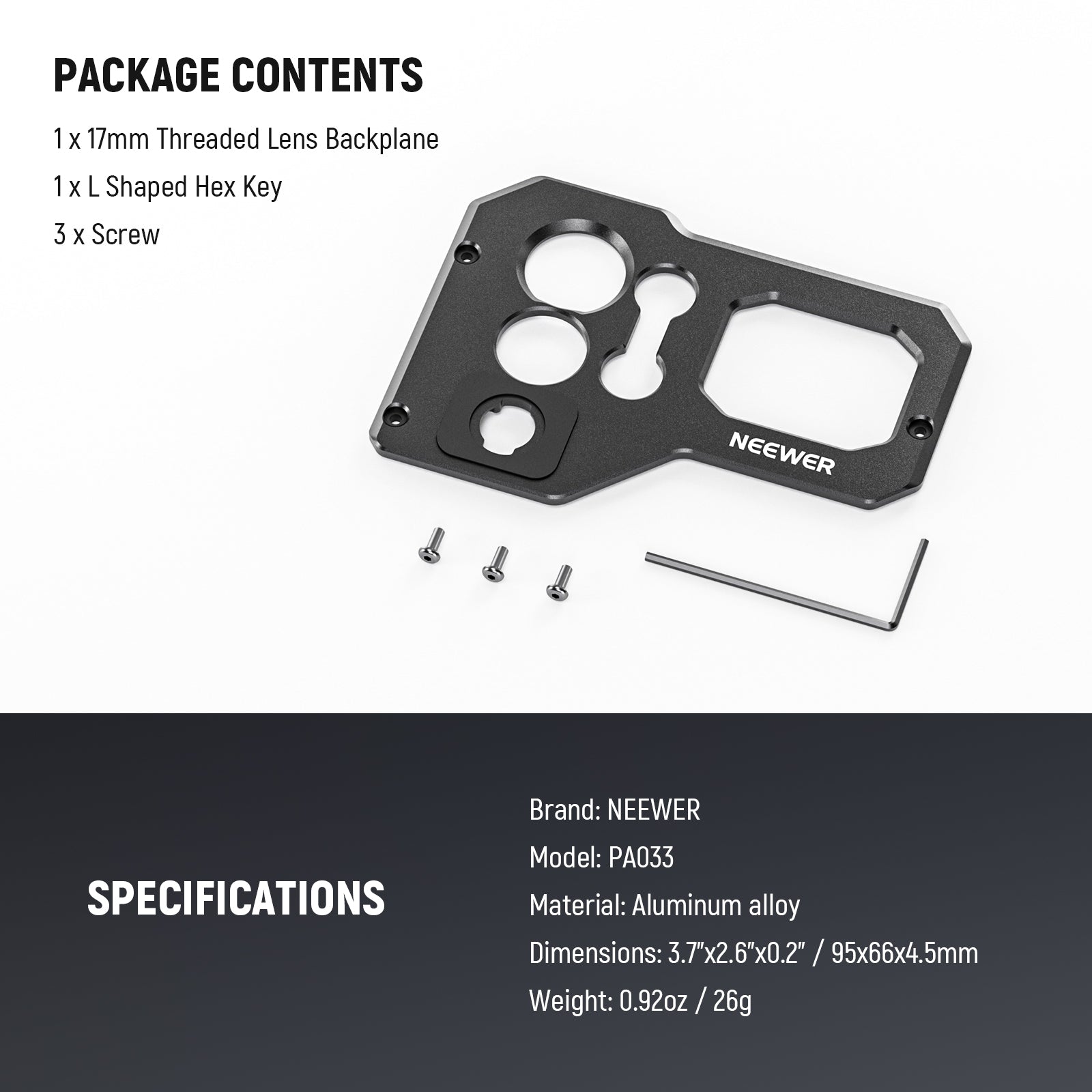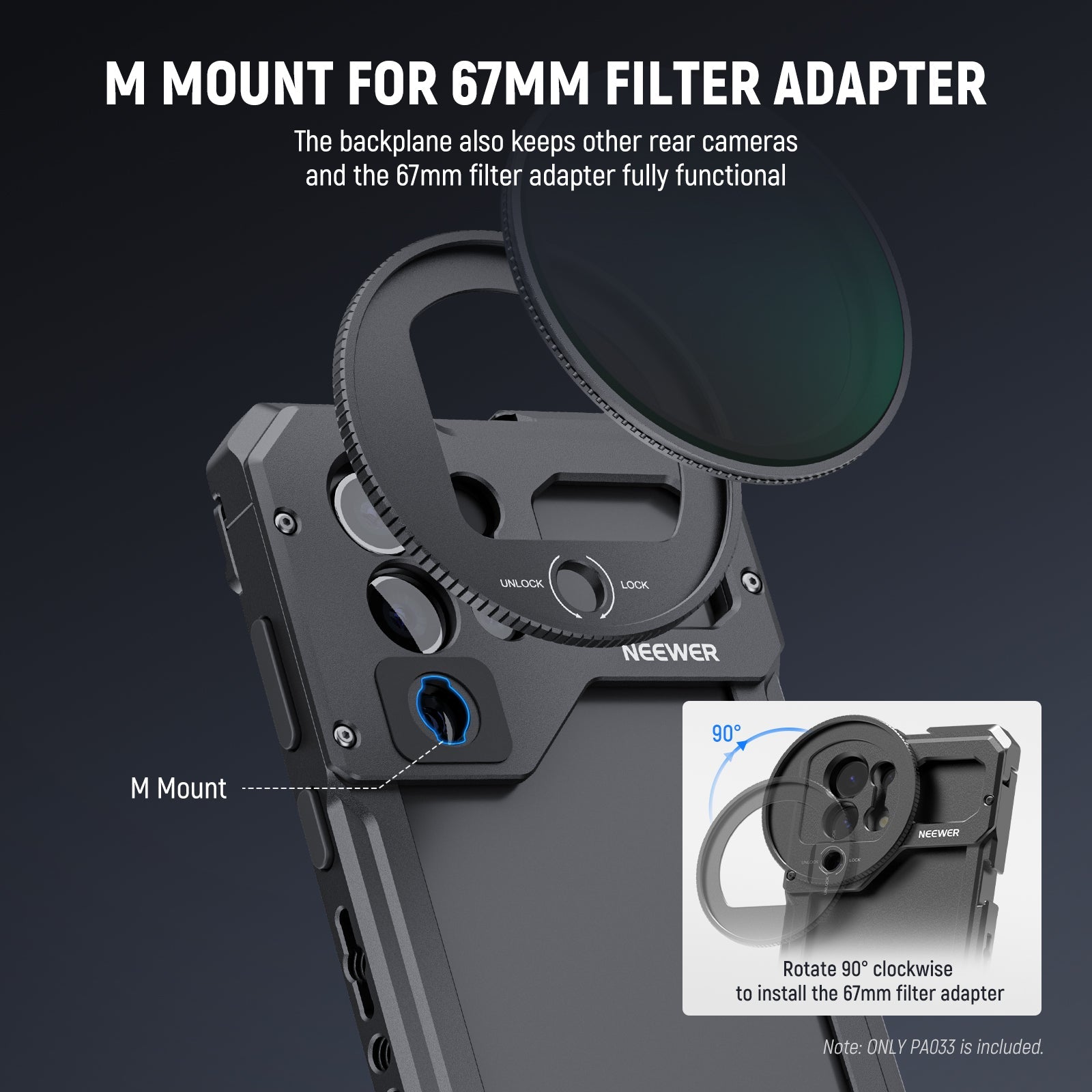 • Designed for PA021 S23 Ultra Cage- Only compatible with NEEWER PA021 Phone Cage for Samsung Galaxy S23 Ultra, this lens backplane allows you to connect external lenses for creative results and doesn’t affect the use of the 67mm threaded filter adapter (not included). Please note that this lens back plate is NOT for Galaxy S22 Ultra phone cage