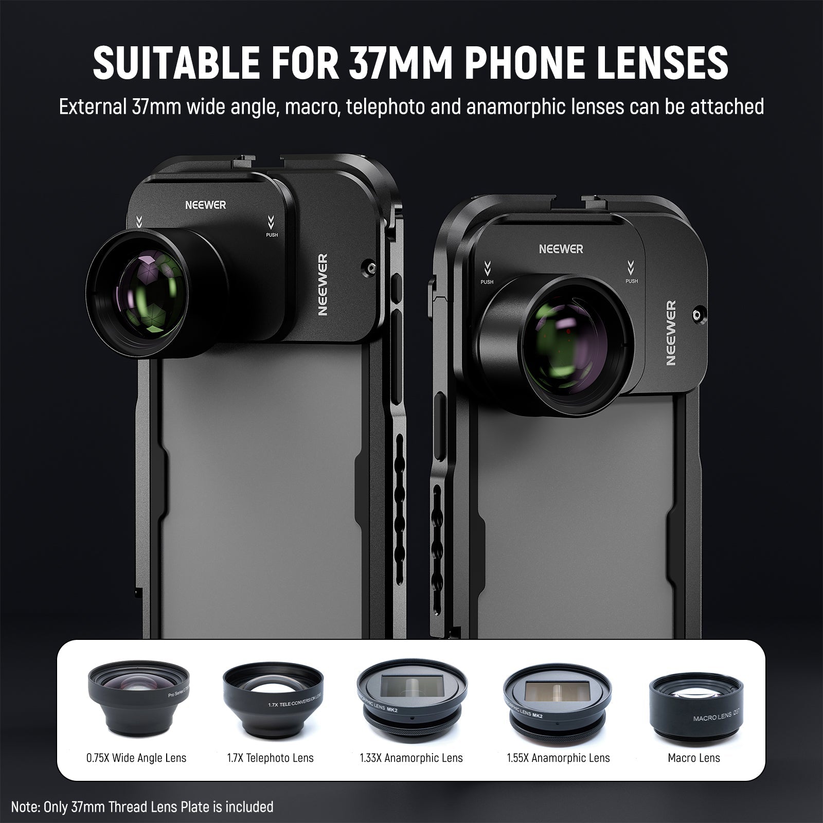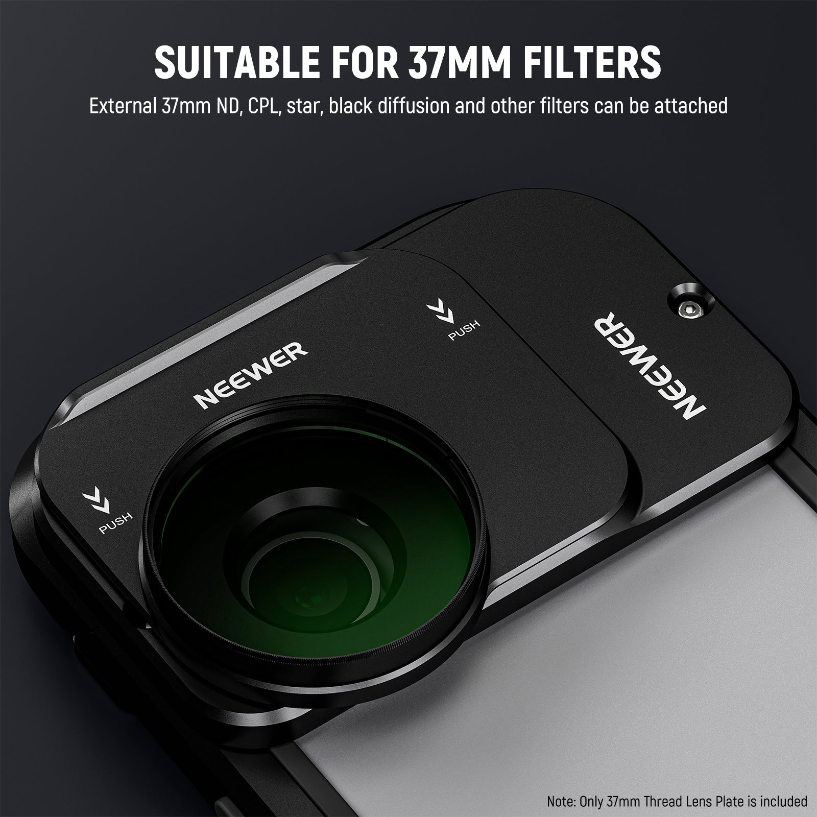 - For 37mm Phone Lenses & Filters- This 37mm threaded lens backplate for iPhone cages can mount 37mm phone lenses and 37mm filters. Compatible with BeastGrip phone lenses, including 0.75X Wide Angle Lens, 1.33X Anamorphic Lens MK2, 1.55X Anamorphic Lens MK2, 1.7X Telephoto Lens, DOF Adapter MK2, and NEEWER 37mm ND, CPL, black diffusion filters, it allows you to capture creative shots on the 48MP Main Camera