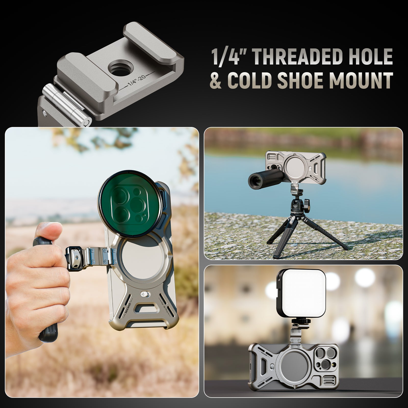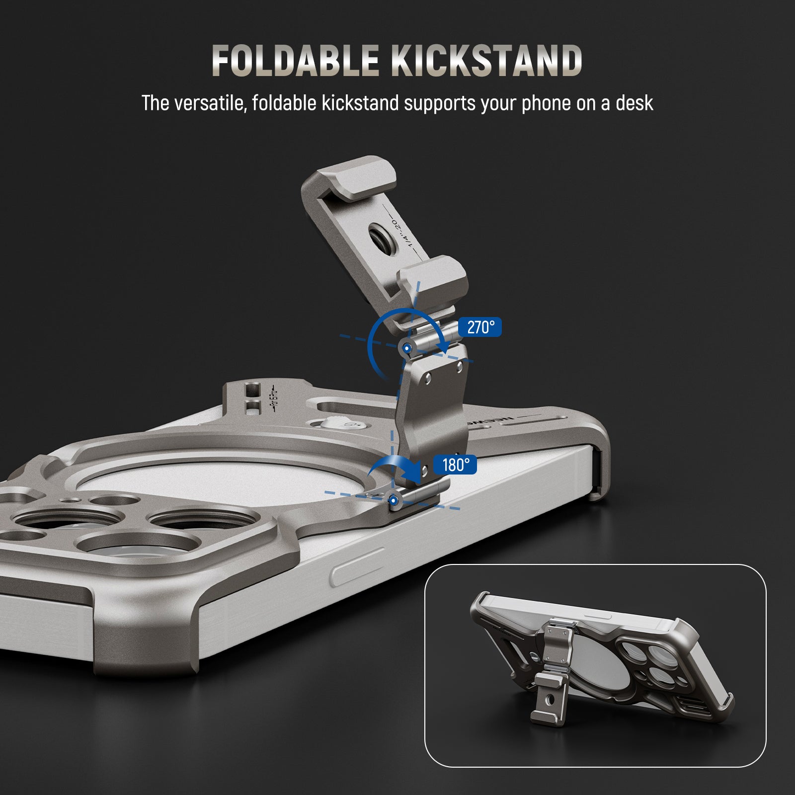 - Foldable Kickstand with Cold Shoe- The versatile, foldable kickstand supports your phone on a desk in both vertical and horizontal positions. It features a cold shoe to connect accessories like the RGB62 LED Light, CM14 PRO Microphone, UA059 SSD Holder, and TP29 Mini Desktop Tripod