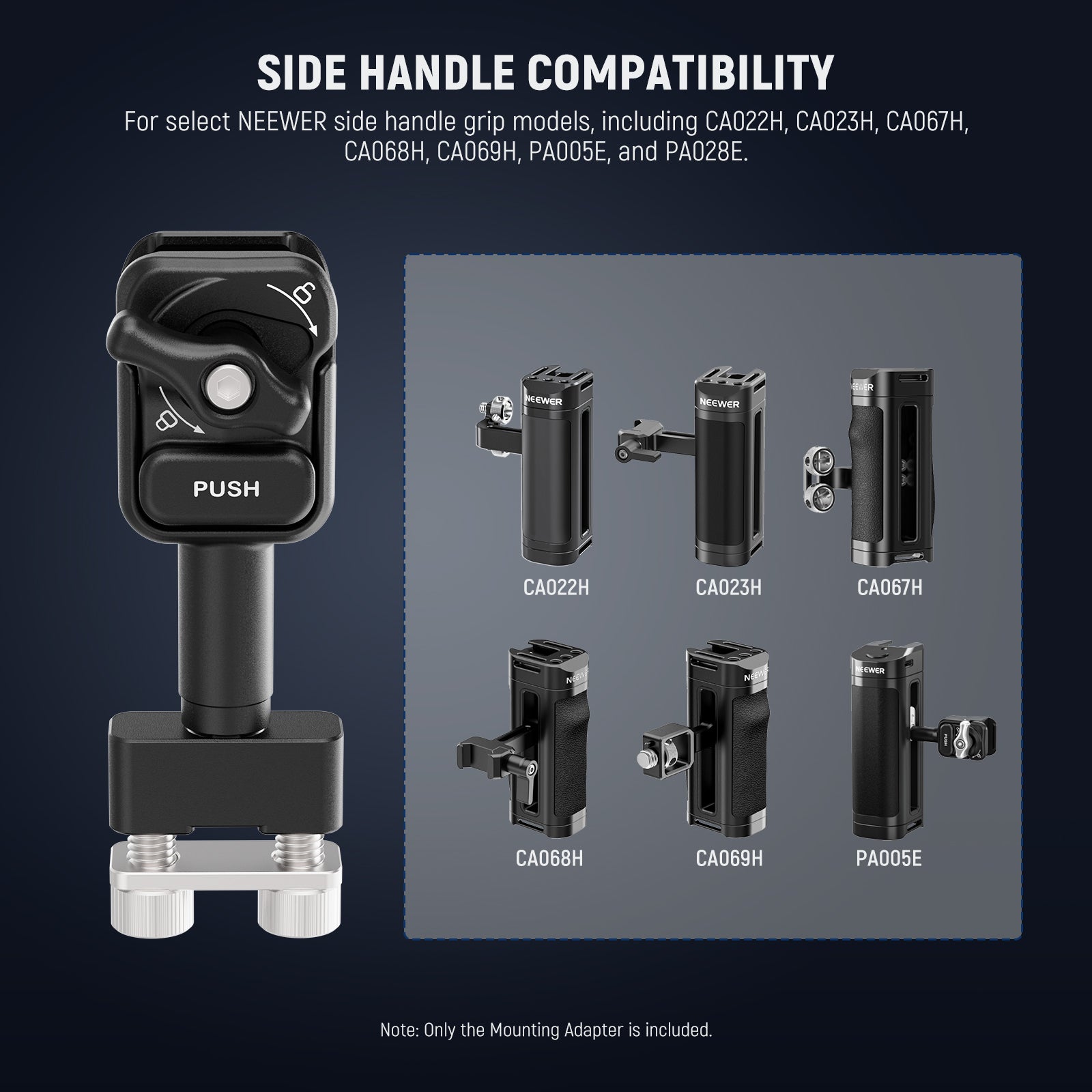 - Side Handle Compatibility- For select NEEWER side handle grip models, including CA022H, CA023H, CA067H, CA068H, CA069H, PA005E, and PA028E. Note: Remove the original connector from your side handle before installing this adapter