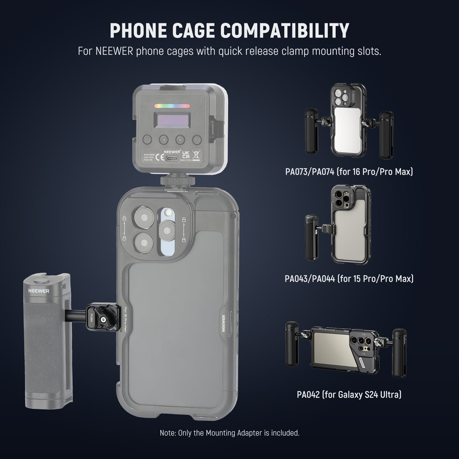 - Phone Cage Compatibility- For NEEWER phone cage accessories models compatible with iPhone Samsung with quick release clamp mounting slots, including PA073 (for 16 Pro), PA074 (for 16 Pro Max), PA043 (for 15 Pro), PA044 (for 15 Pro Max), PA082 (for Galaxy S25 Ultra), and PA042 (for Galaxy S24 Ultra)