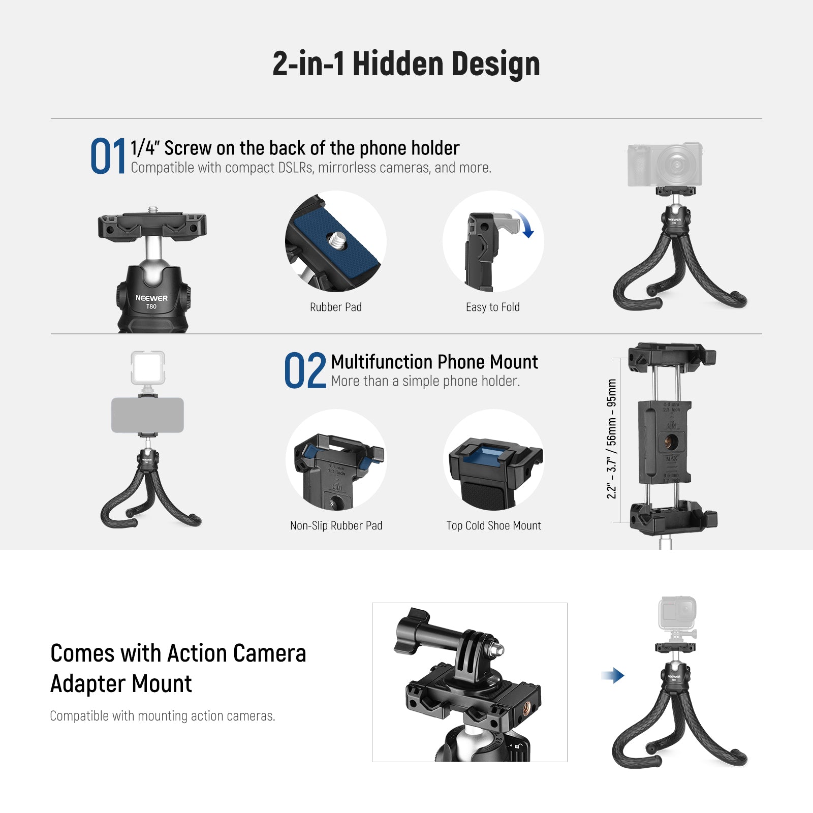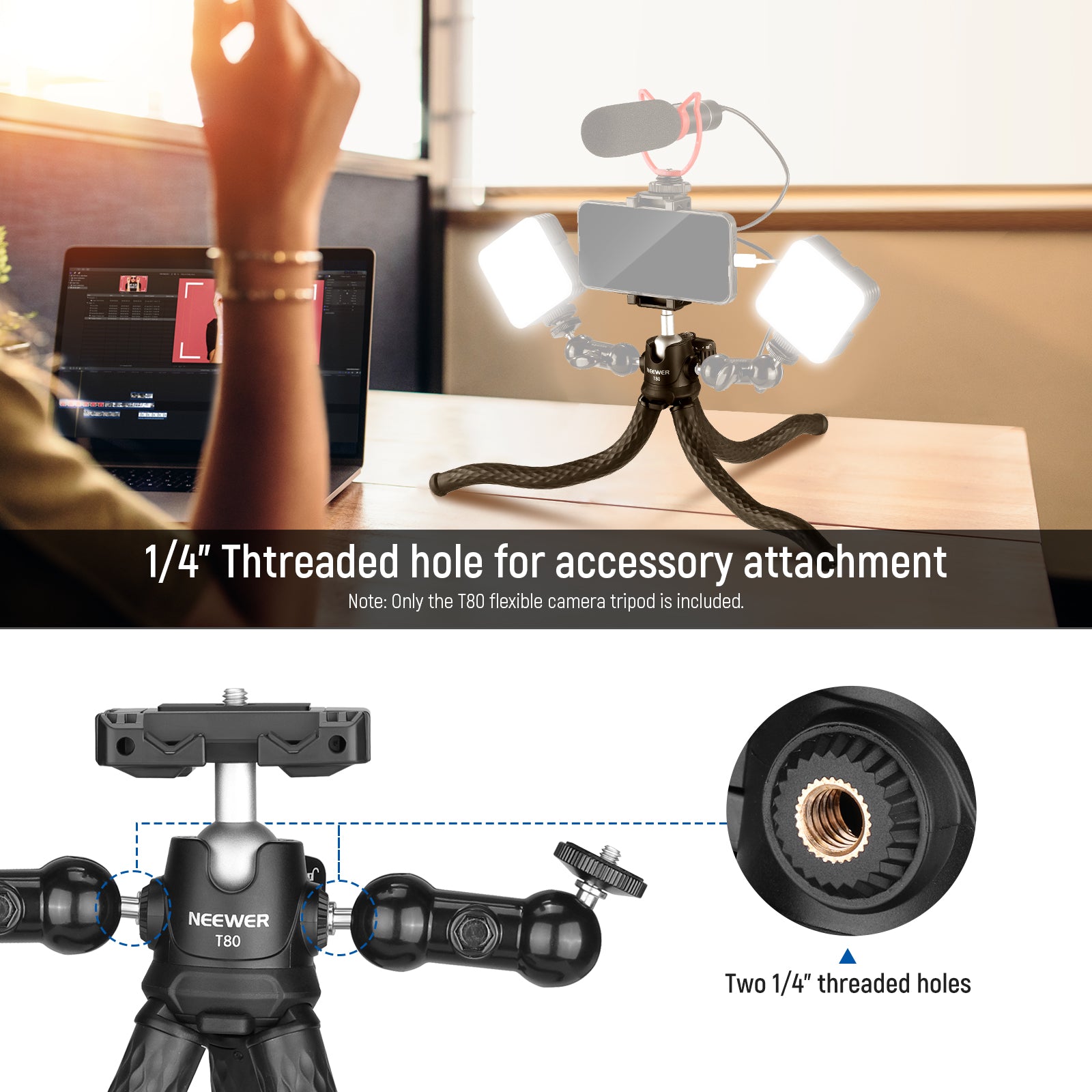 - NEEWER T80 Flexible Camera Video Tripod can wrap on objects like tree branches, handrails, and signposts or stand on your desk. It supports mirrorless and vlog cameras via the 1/4” screw or action cameras via the mount adapter. Max load capacity: 4.4lb (2kg).