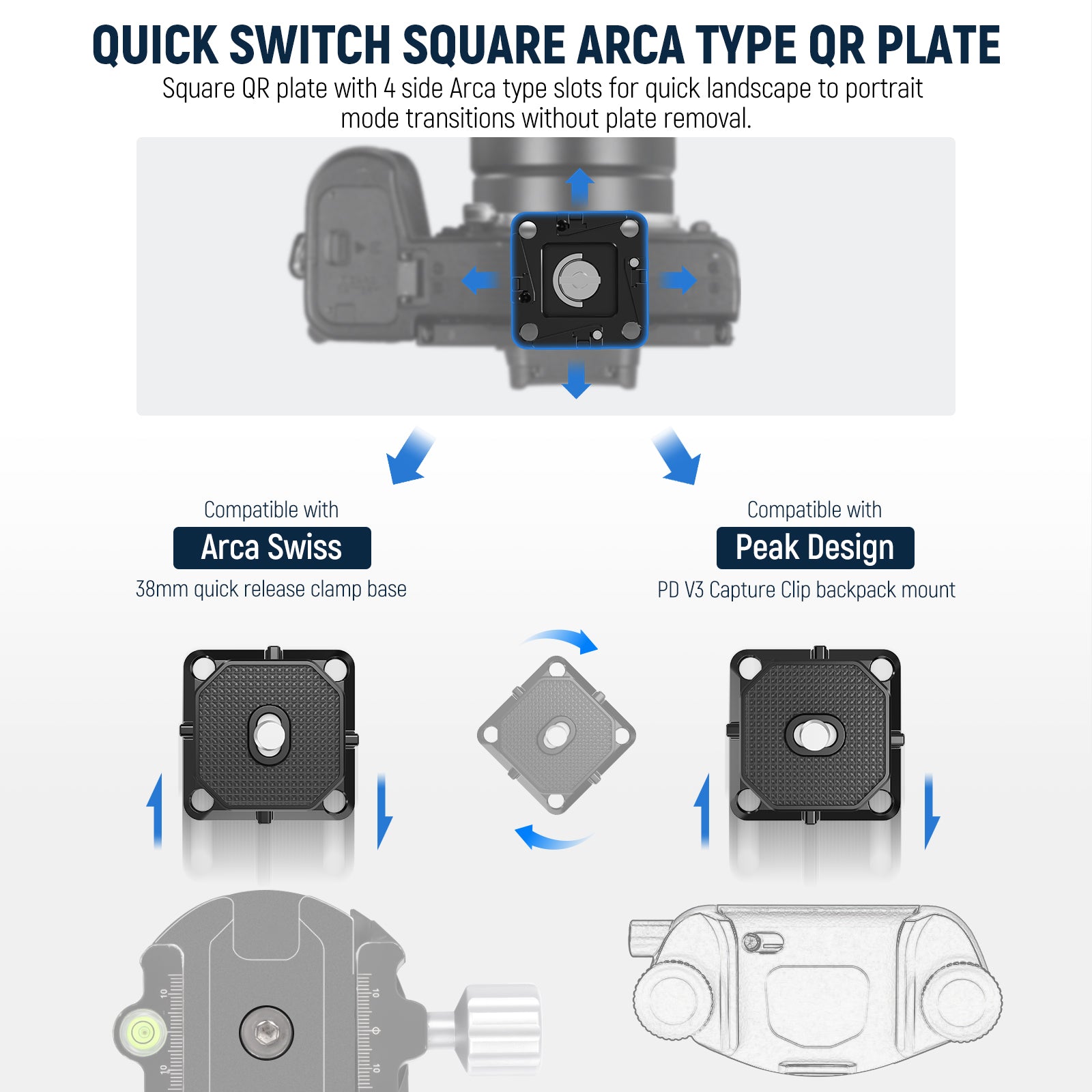 - Quick Switch Arca Type QR Plate- Effortlessly mount your camera on a tripod, monopod, stabilizer, slider, or handgrip with an identical mounting system, and ensure quick swap out among these supports. Perfectly compatible with arca swiss 38mm plate clamp base, compatible with Peak Design PD Capture clip V3, compatible with Ulanzi F38, compatible with Falcam F38 backpack shoulder strap gimbal stabilizer quick release mount