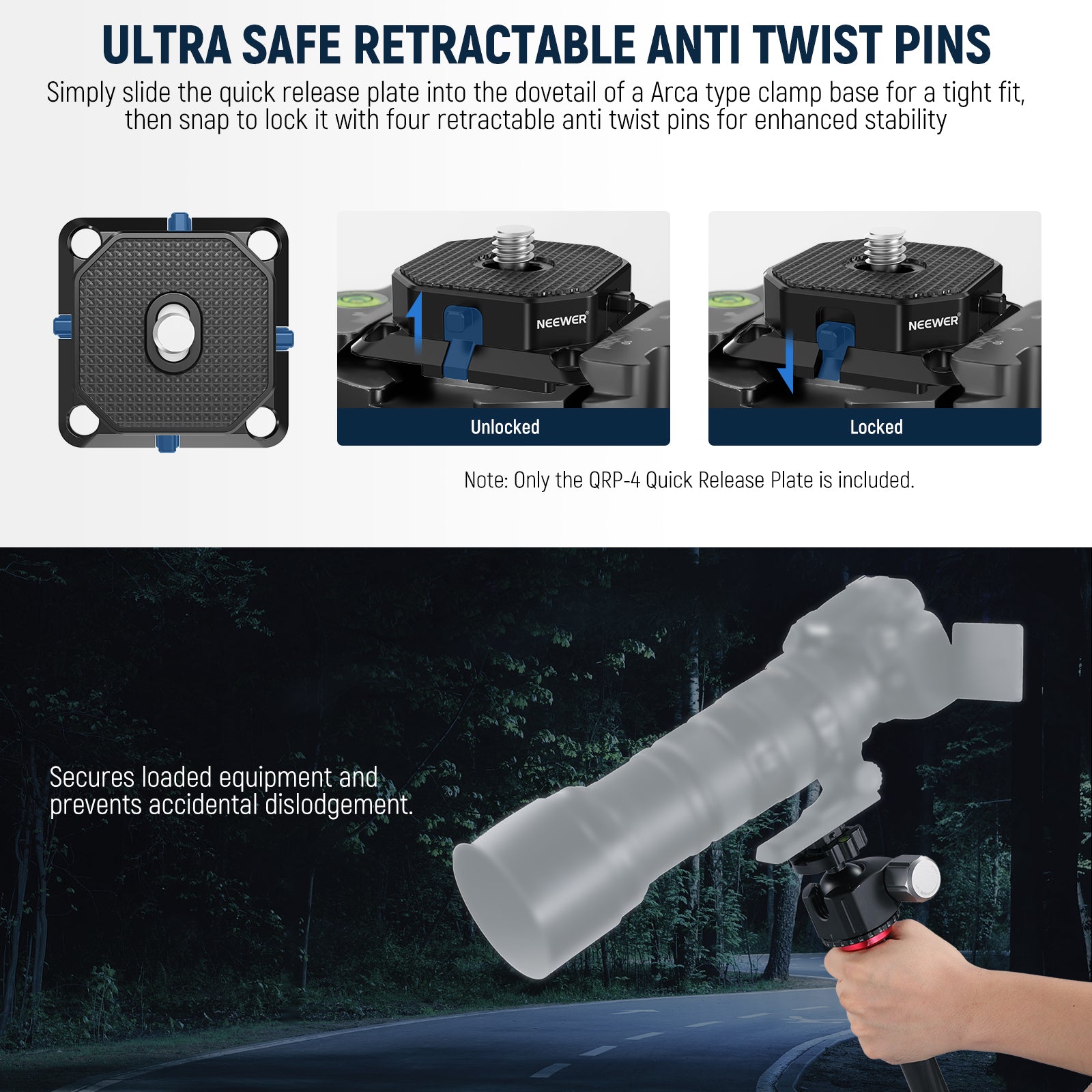 - Ultra Safe Retractable Anti Twist Pins- Simply slide the quick release plate into the dovetail of a Arca type clamp base for a tight fit, then snap to lock it with four retractable anti twist pins for enhanced stability