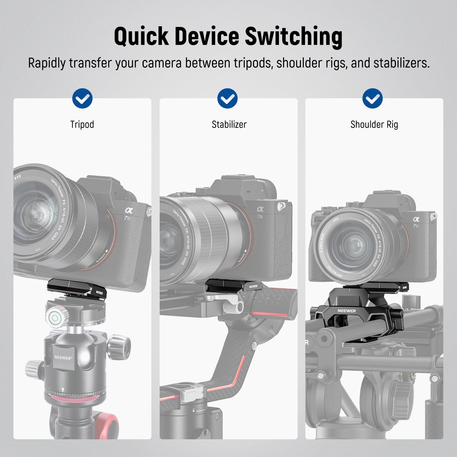 • Quick Switch Design- NEEWER SR006 is a LWS camera baseplate with dual 15mm rod clamps that features Arca Type quick release plate, clamp, and base, compatible with BMPCC 4k 6k Z CAM Sony FX30 FX3 Canon R5 R6 M50 Panasonic Lumix GH5 cinema cameras, DSLRs, camcorders, as well as camera cages with Arca Type base, compatible with Smallrig cages. It enables a quick switching camera mount on an arca type tripod head, gimbal stabilizer, or shoulder rig with the dual 15mm rods