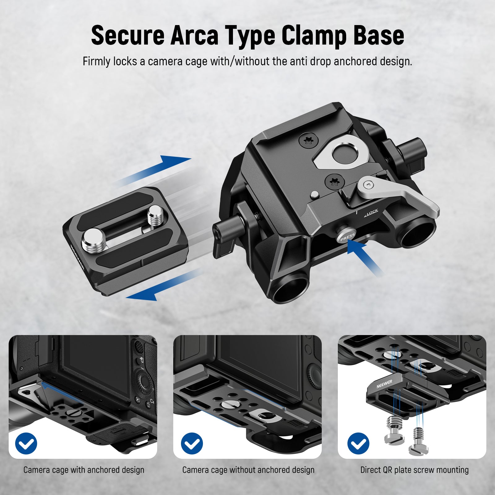 • Triple Security Arca Type QR Plate & Clamp- The QR plate with anti drop anchored design and rubber pad, and the clamp base with a retractable pin provide triple security for the camera mount via the 1/4" 3/8" screws, compatible with DJI RS 2 RSC 2 RS 3 Pro gimbals. The side quick lock tab allows a fast switch between a shoulder rig, tripod head, and stabilizer. You can mount a cage with an Arca base to the clamp directly, or add extra stability by attaching it to the QR Plate first