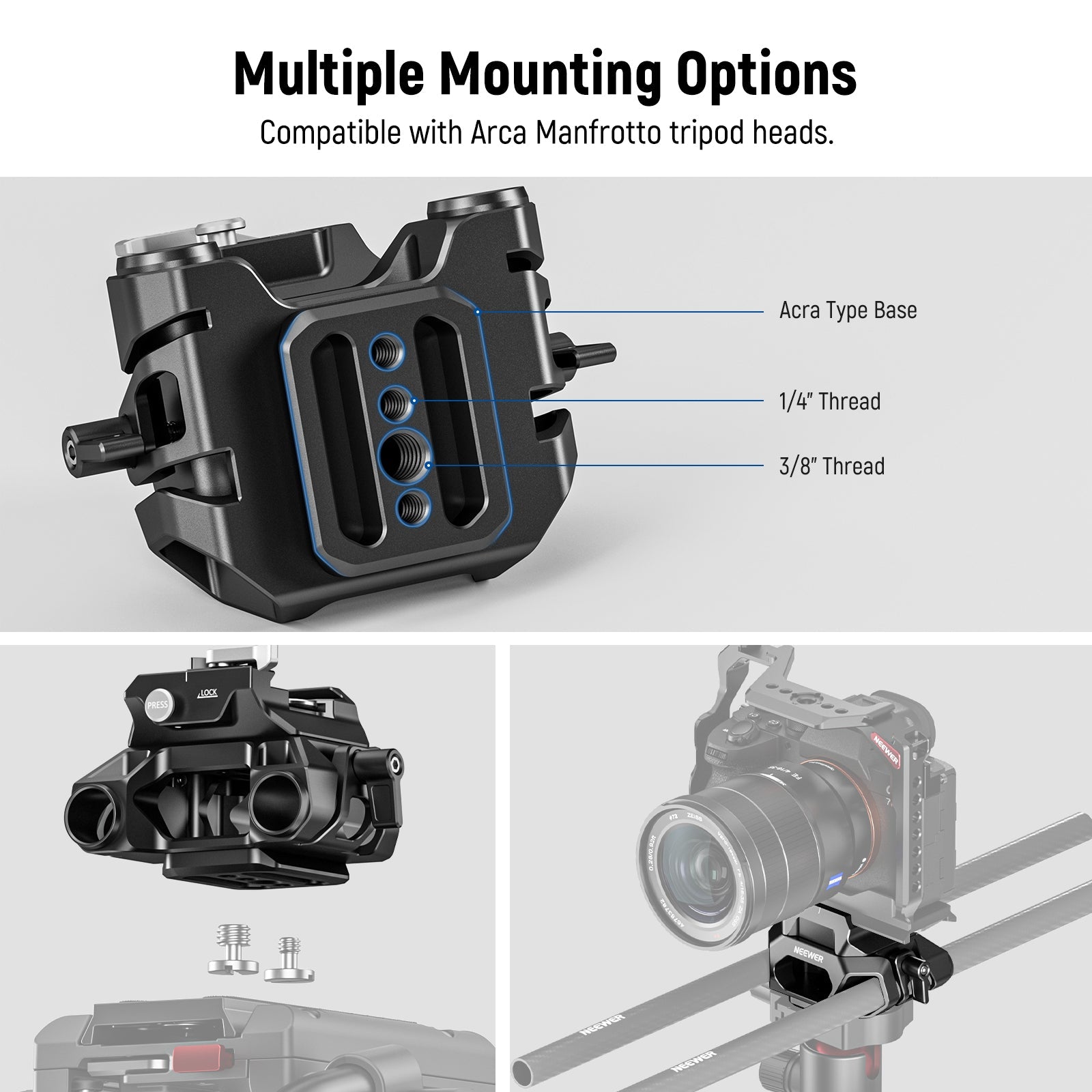• Arca Type Camera Base Plate with Threads- The bottom base of this LWS support is also integrated with Arca type dovetails, three 1/4" threads, and a 3/8" thread for connection with various tripods and support equipment