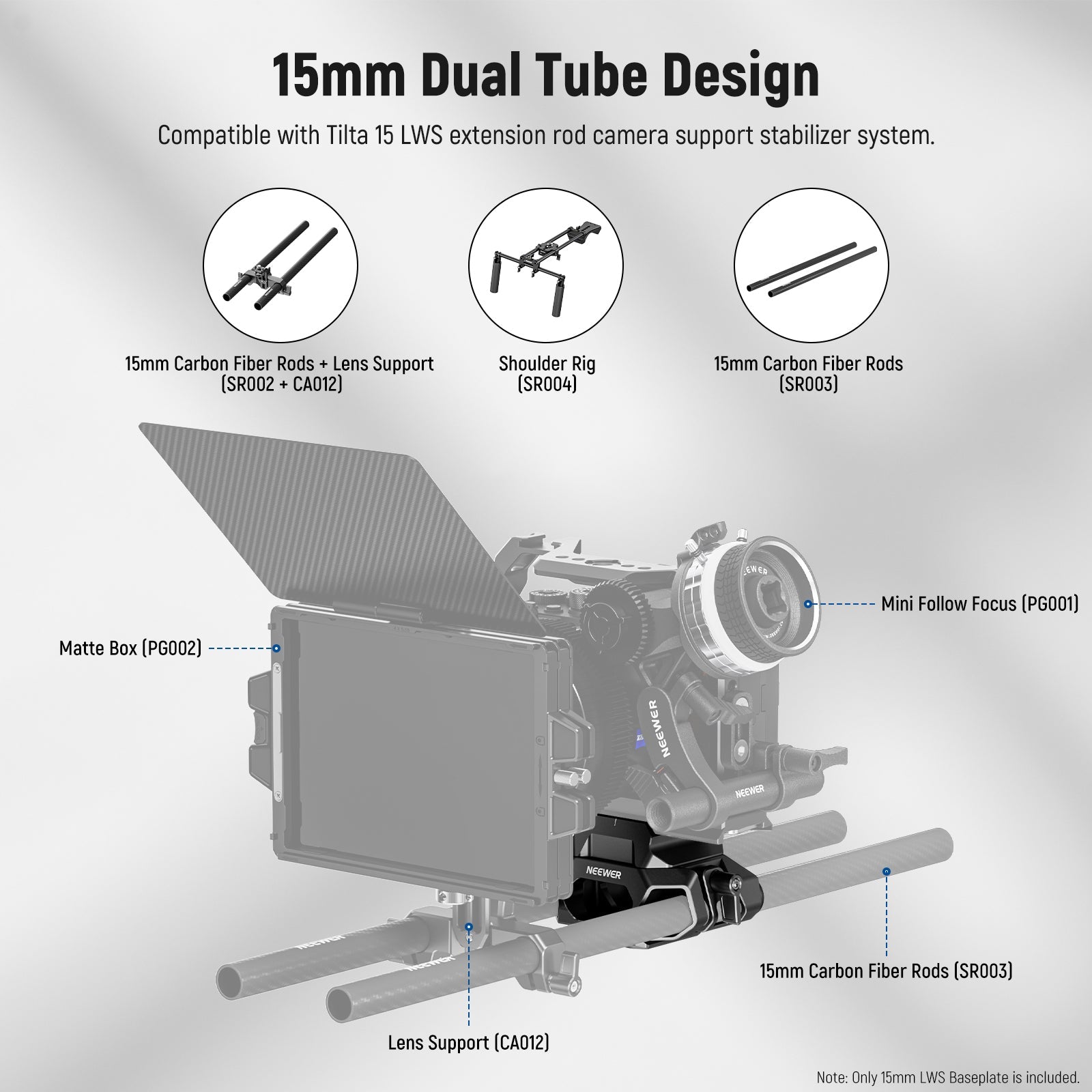 • For Devices with 15mm Rod Rail- Designed with dual 15mm rod clamps and a standard 60mm rail gauge, the baseplate can work with the shoulder rig (SR004), matte box (PG002), mini follow focus (PG001/PG003), lens support (CA012), carbon fiber 15mm rods (SR002/SR003), and other devices with the 15mm rod rail support system. Compatible with Tilta 15 LWS extension rod camera support stabilizer system